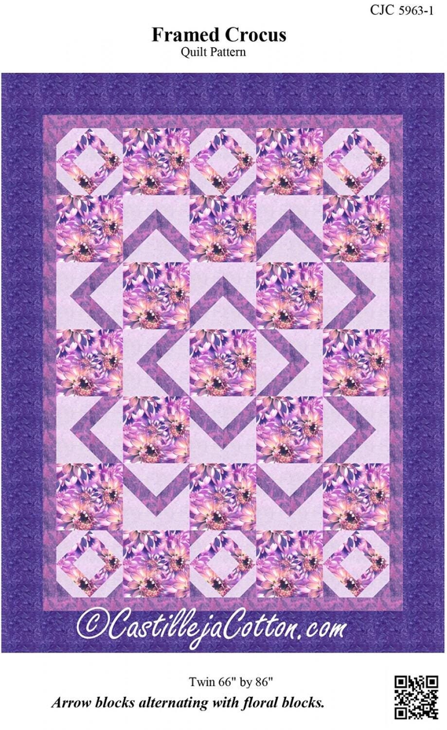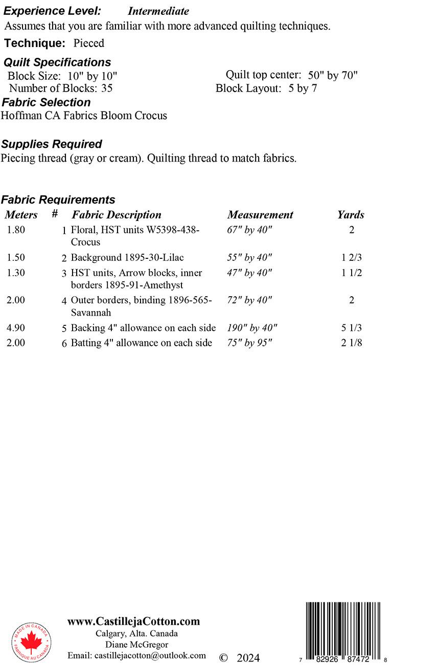 Arrow blocks alternating with floral blocks. Fabric shown in the sample quilt is Hoffman CA Fabrics Bloom Crocus (Available 2024-08-01) Colors: purple, pink A vibrant quilt pattern with a square pattern in shades of purple and pink.