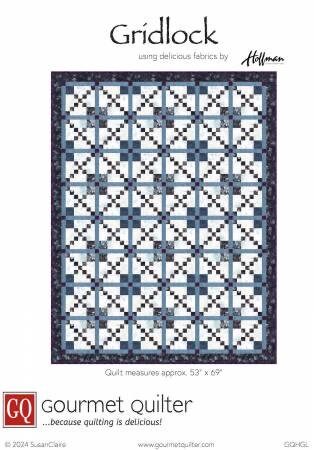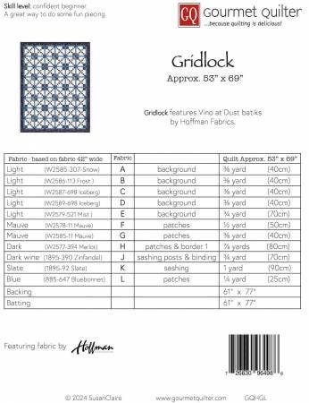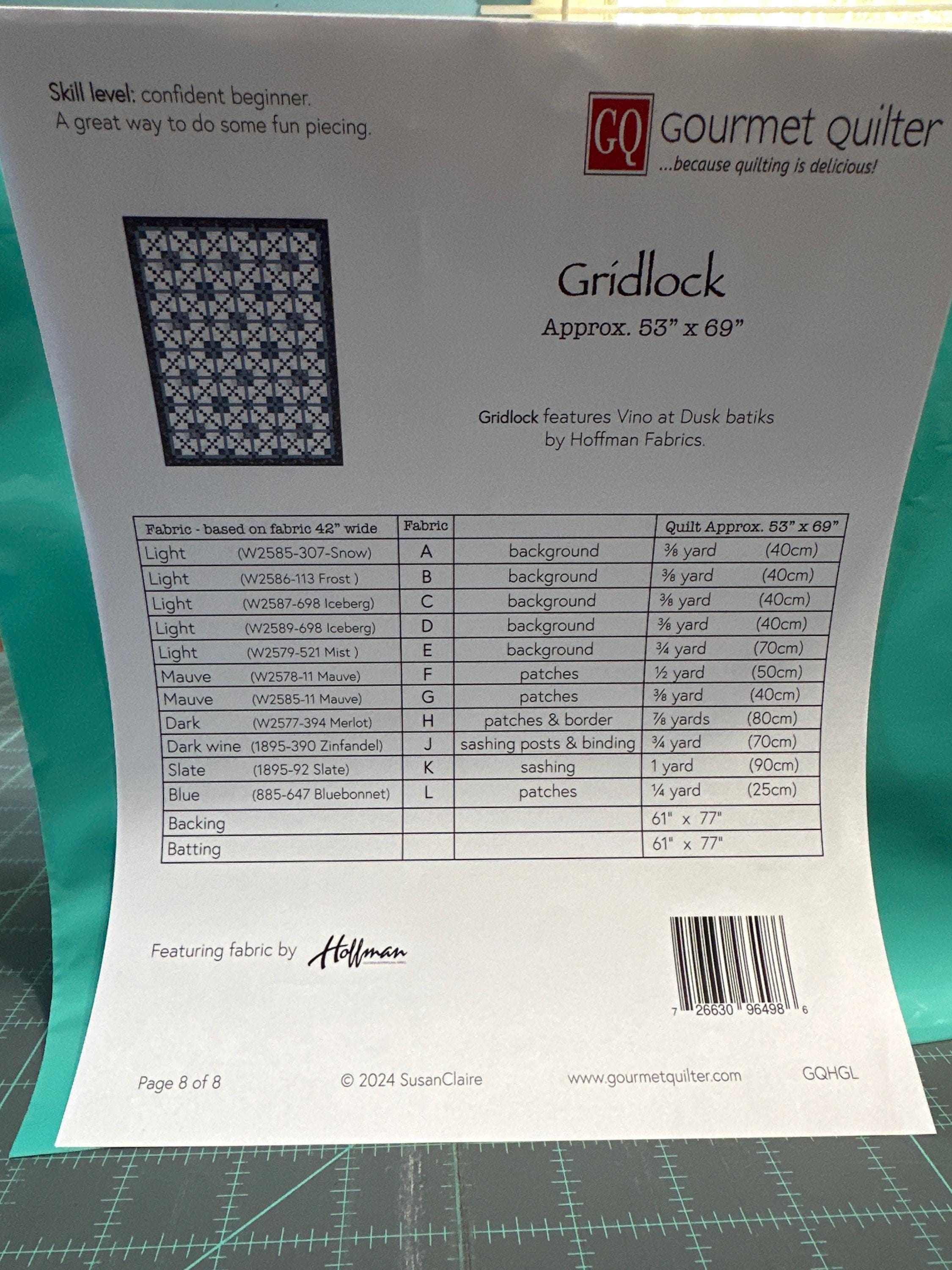 Gridlock, measuring 53" x 69", is a delightfully pieced quilt featuring Vino at Dusk batik s by Hoffman Fabrics. Great for a confident beginner.