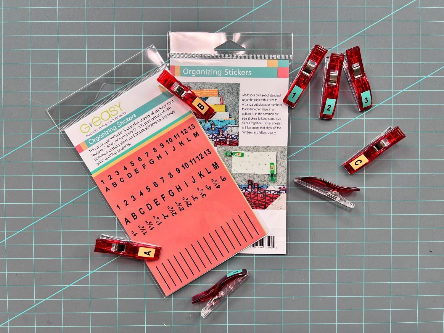 GEasy Organizing Stickers includes three colorful sheets that feature stickers with 2 sizes of printed letters A-M and numbers 1-13, blank customizable stickers and common cutting measurements to adhere to clips. These handy stickers are perfect for keeping your projects organized.