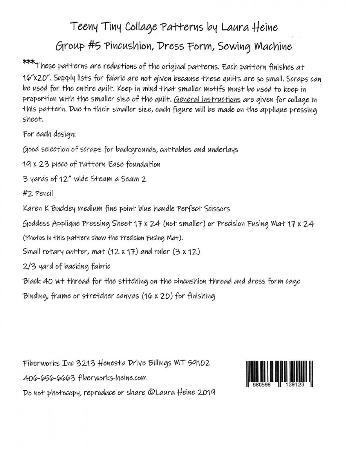 Teeny Tiny Group 5 Collage Pattern by Laura Heine features Pincushion, Dress Form and Sewing Machine. Pattern features complete step by step color instructions and 3 full size patterns each finish at 16x20