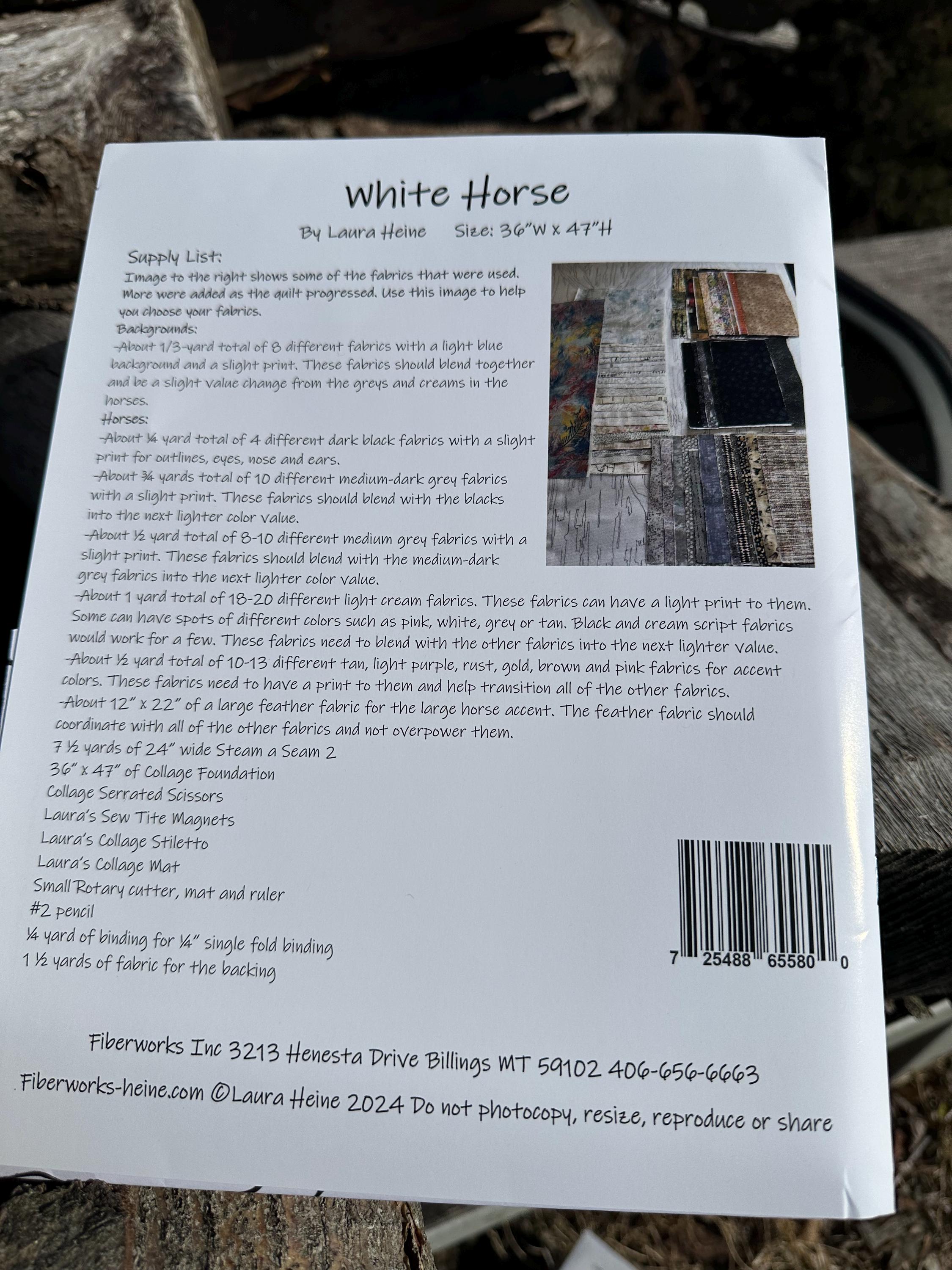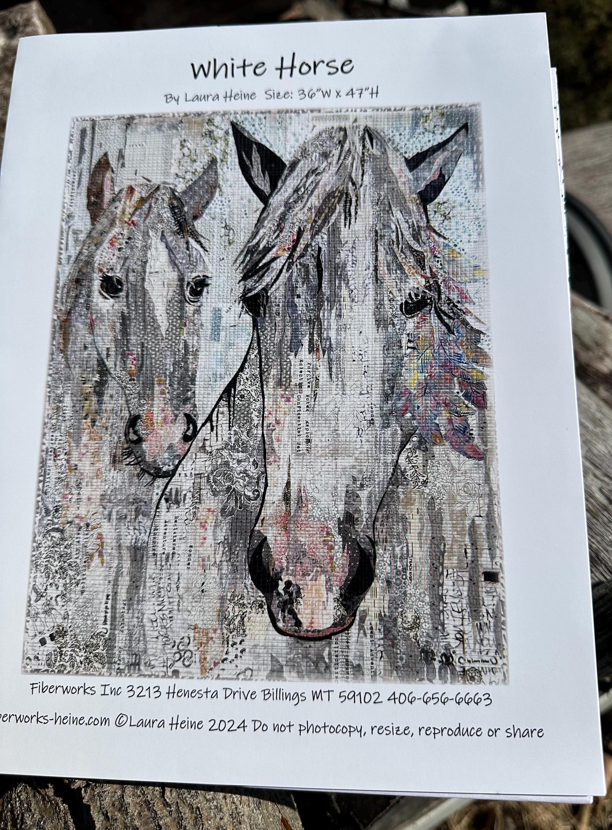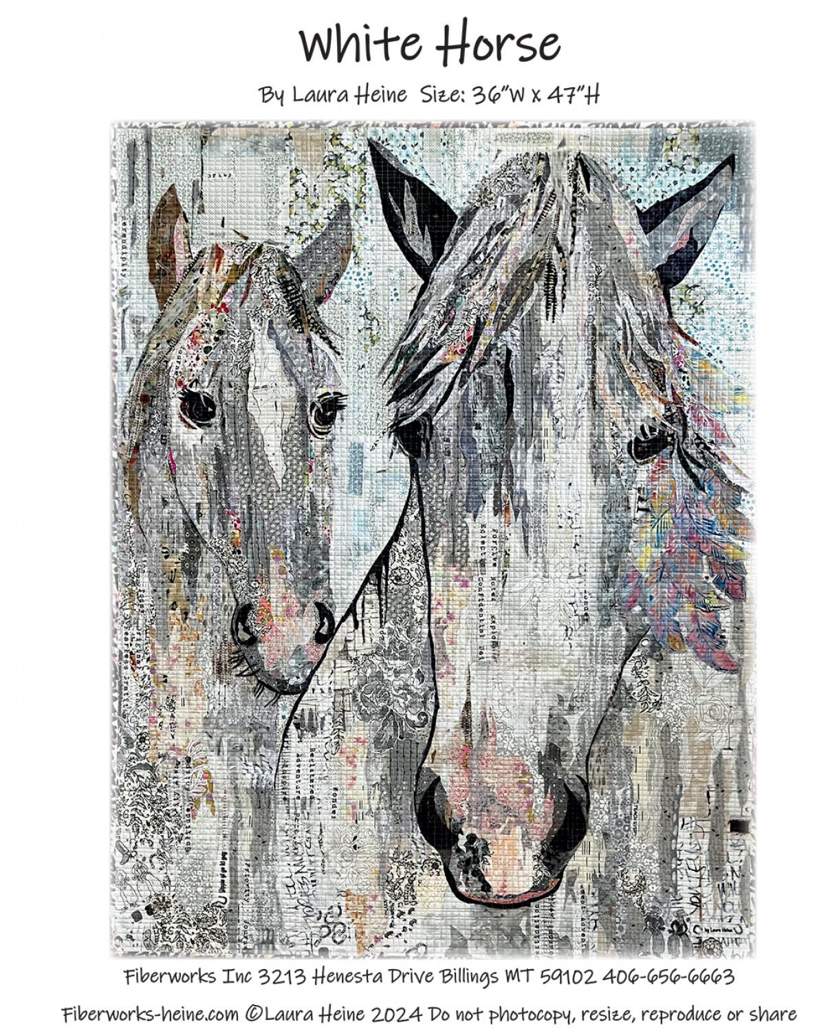 White Horse Collage Pattern by Laura Heine. This pattern focuses on successfully using a limited palette, working with a single color in a range of values. It is an Advanced Collage Pattern. White Horses are symbols of purity, victory, and transformation. This pattern includes a full-size pattern with colorful step-by-step instructions to complete this collage.