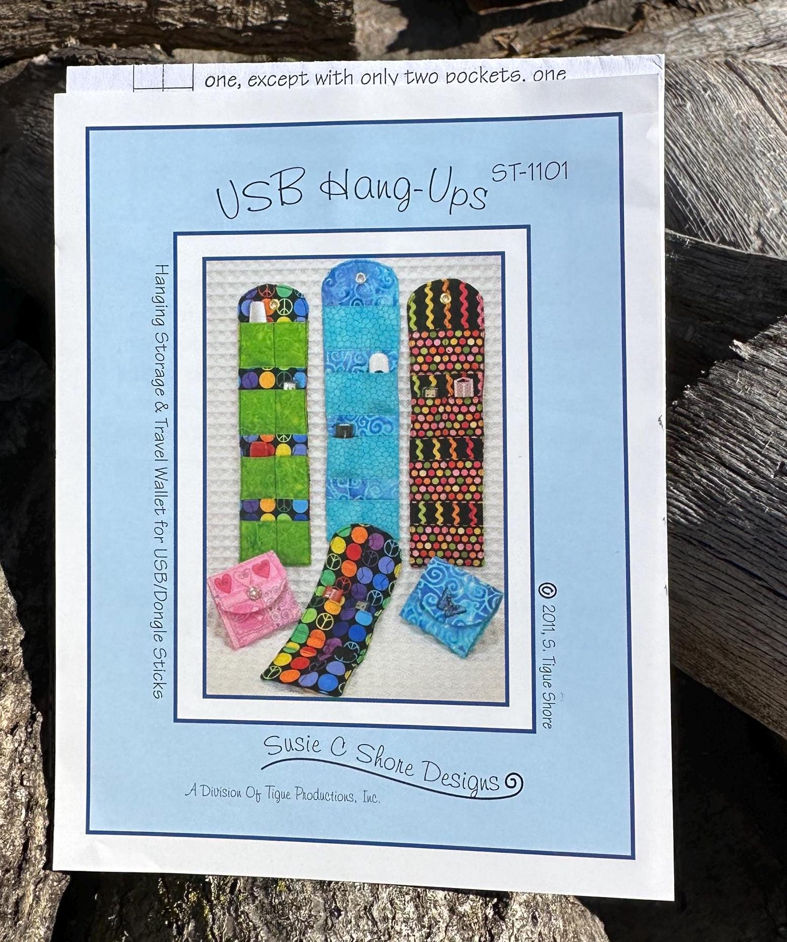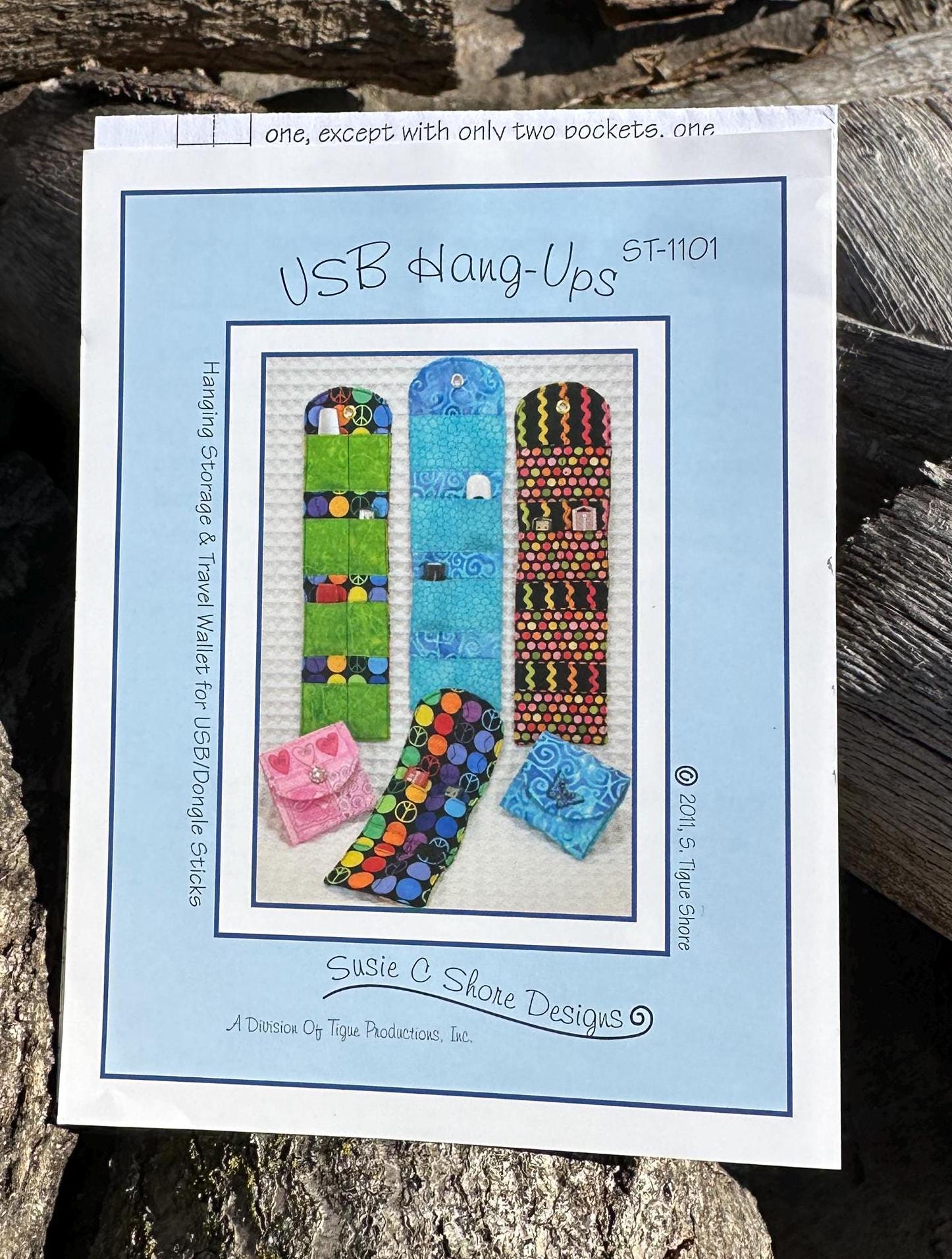 These USB/Dongle/Memory Stick hanging storage pieces are a neat way to organize and store multiple data sticks while keeping them close at hand, or as a Roll-Up Wallet which can be hung up when not traveling to work or classes. Cinch to make and fun to give as gifts! Fat quarter Friendly Too!