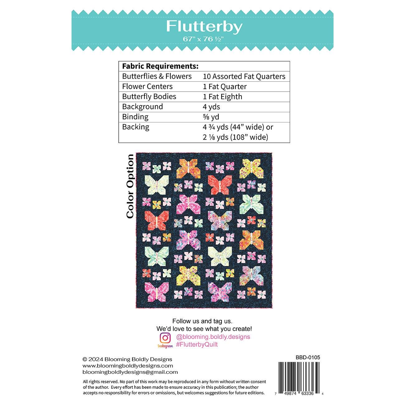 The Flutterby quilt pattern by Leslie Ryan of Blooming Boldly Designs is fat quarter friendly and features pieced butterflies and blossoms. Finished size is 67" x 76 1/2". Traditional piecing methods.