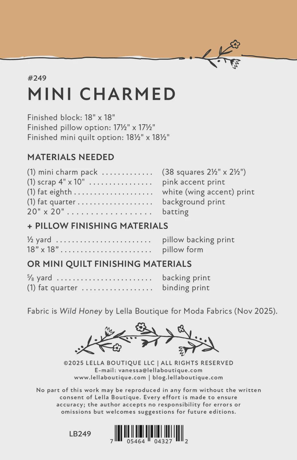 Let your scraps take flight with this whimsical butterfly made from 2-1/2" squares. With just a sprinkle of mini charm magic, you'll create a sweet little masterpiece that will have your heart fluttering like it's springtime. The hardest part? Deciding if you will finish it as a pillow or mini quilt! Finished Block: 18" x 18" Finished Pillow: 17-1/2" x 17-1/2" Finished Mini Quilt: 18-1/2" x 18-1/2" Skill Level: Confident Beginner MATERIALS NEEDED (1) mini charm pack. (38 squares 2-1/2" x 2-1/2") (1) scrap 4" x 10" pink accent print (1) fat eighth white (wing accent) print (1) fat quarter background print 20" x 20" batting