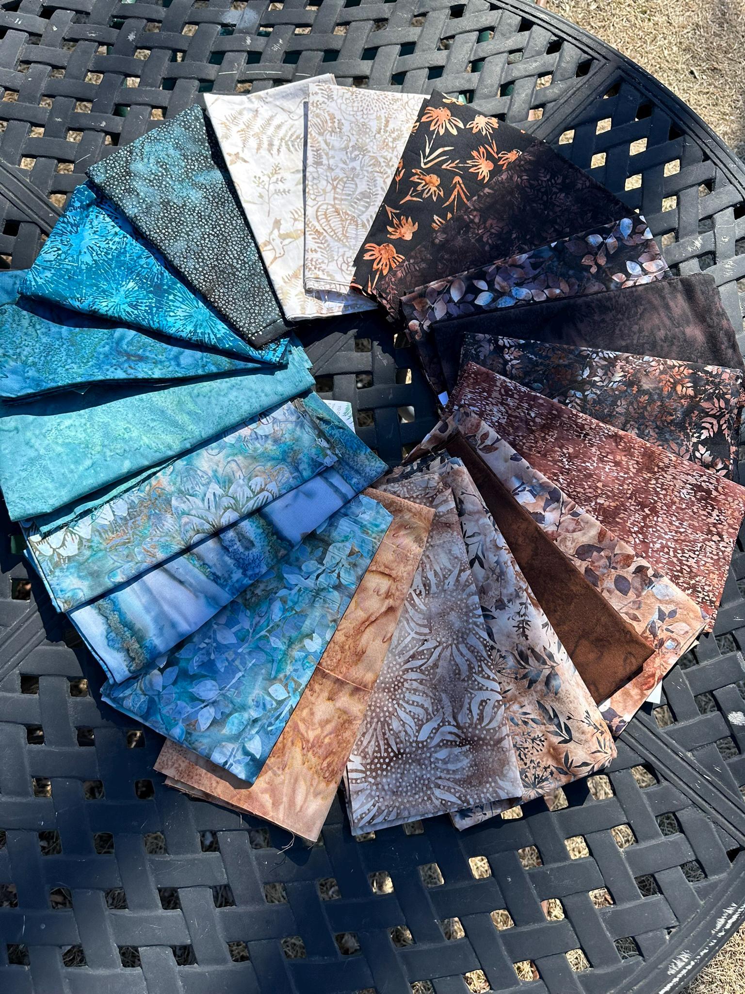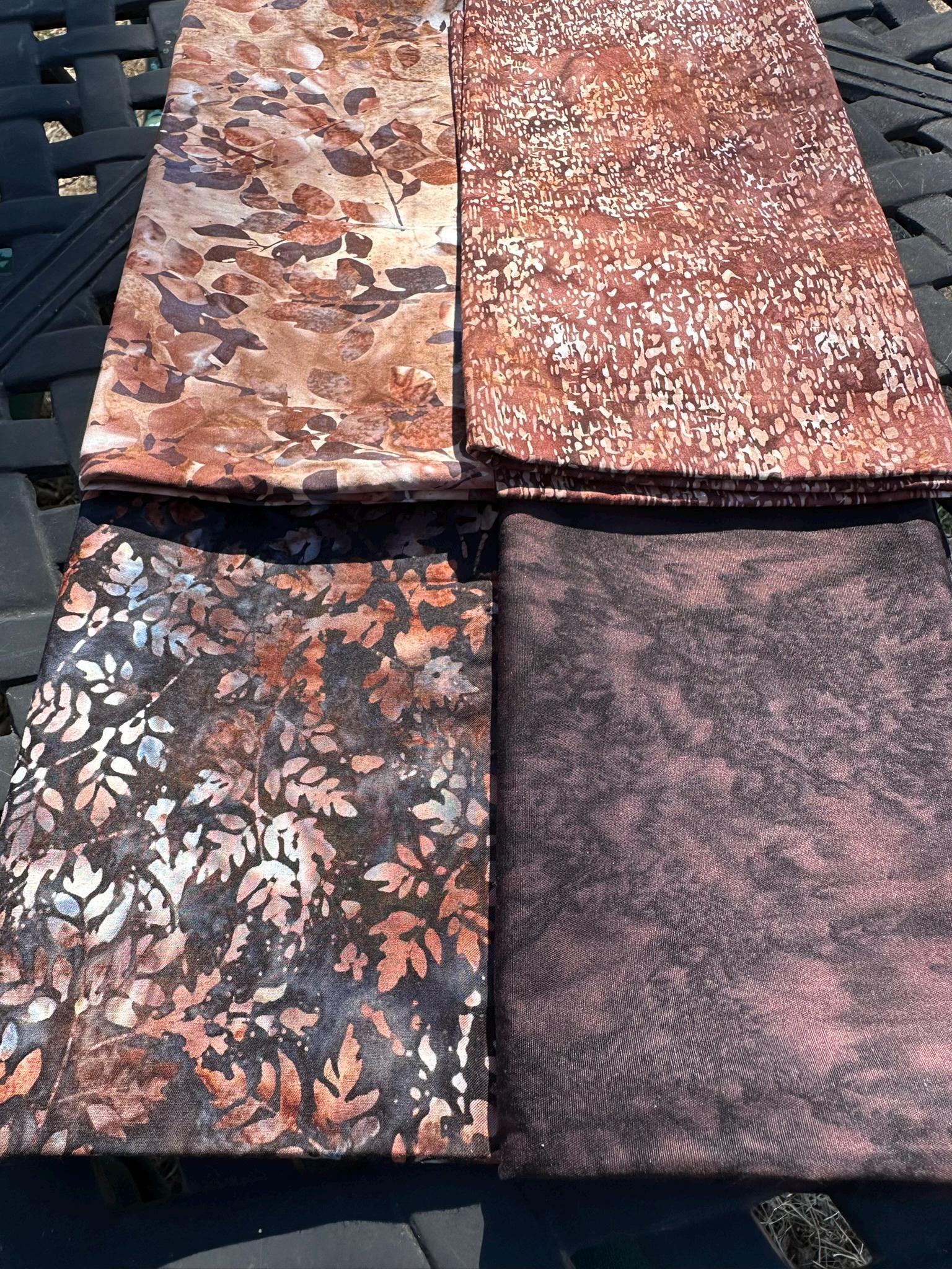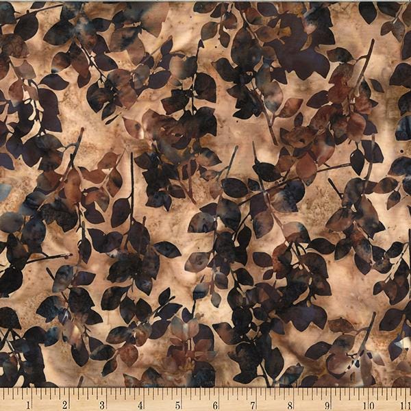 100% Cotton. 44/45" wide. Avg. bolt 15 yards. Hand-dyed batik made in Bali featuring original Hoffman design. Browns, Tans, Reminds me of Eucalyptus Leaf