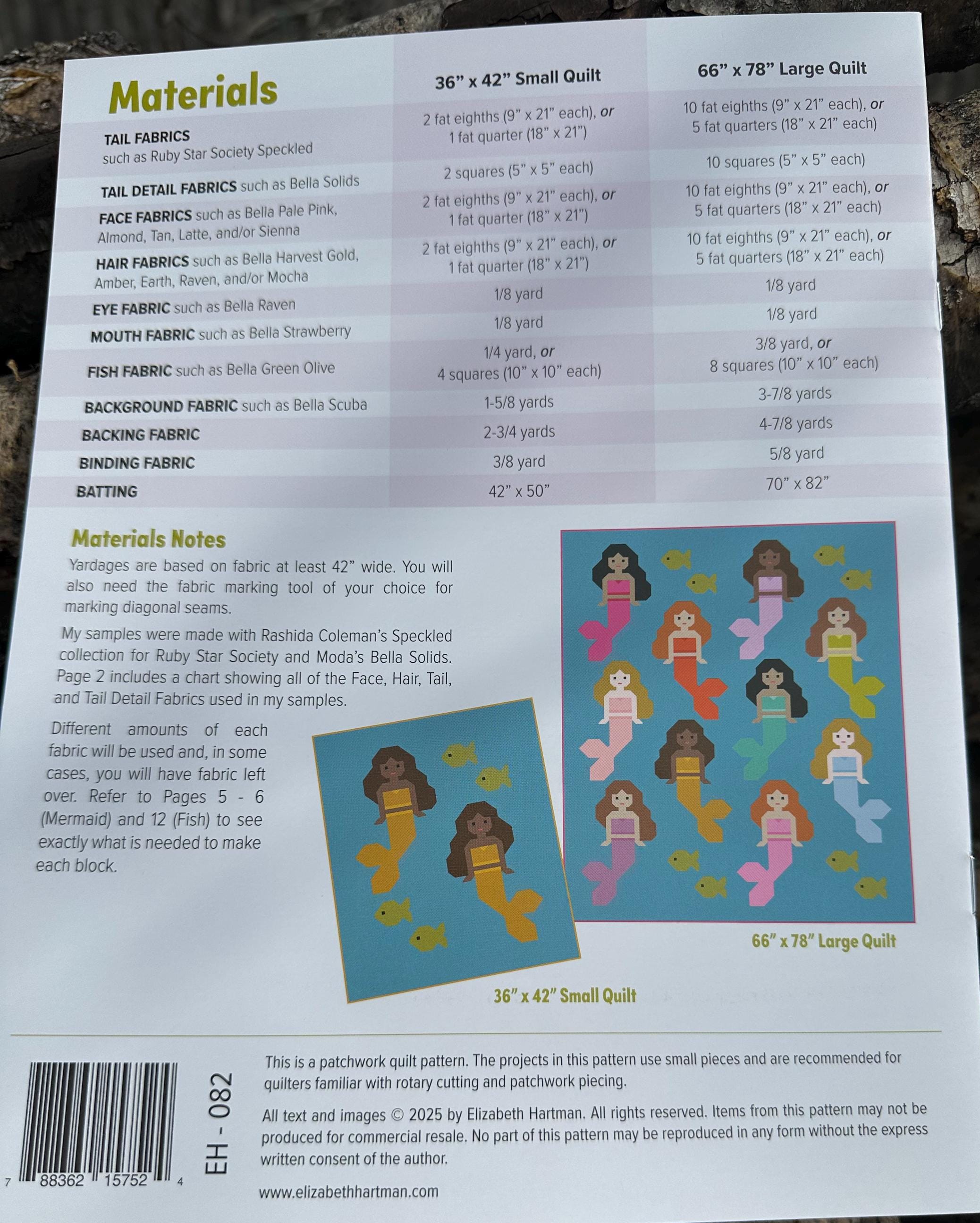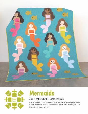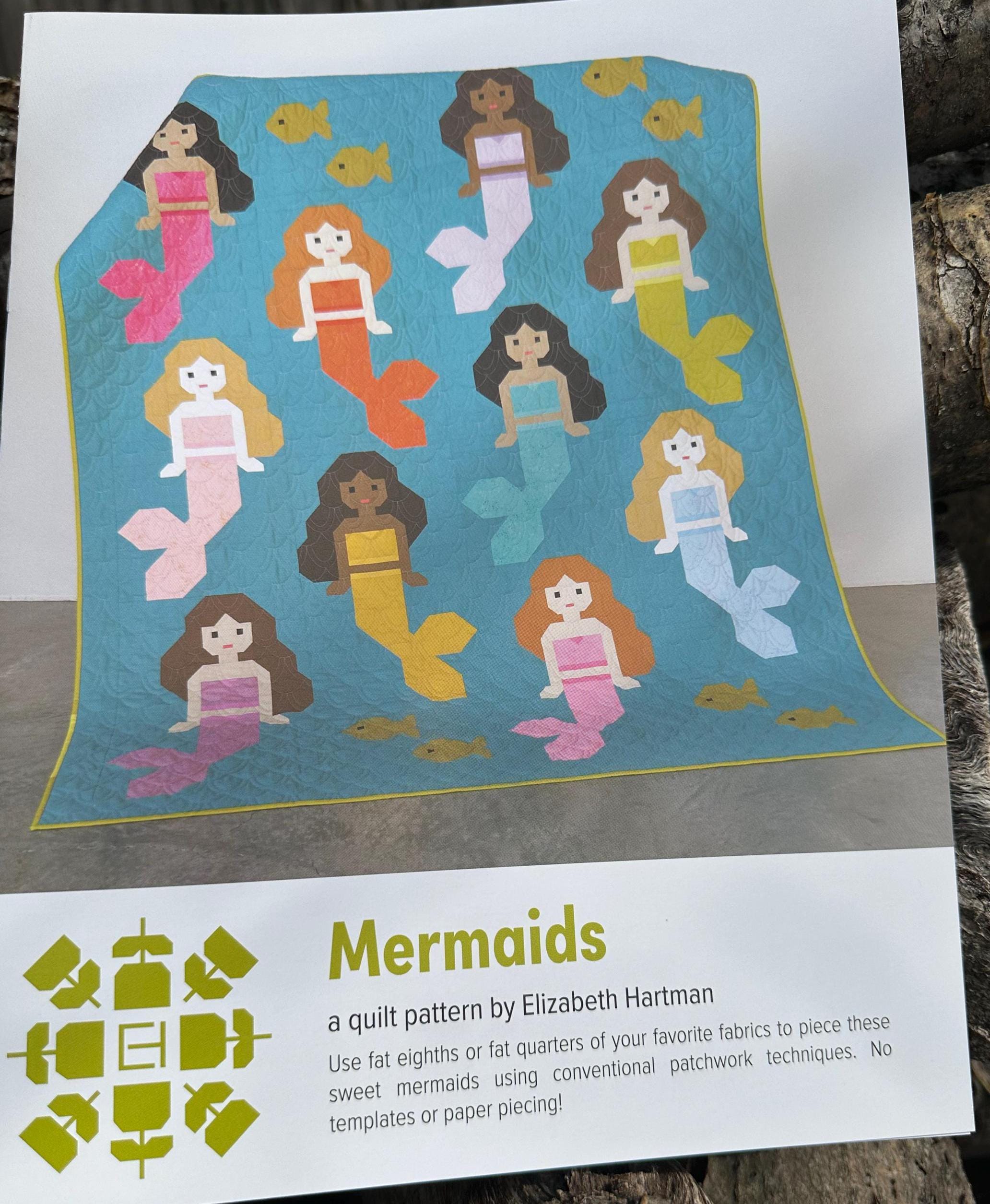 Use fat eighths or fat quarters of your favorite fabrics to piece these sweet mermaids using conventional patchwork techniques. No templates or paper piecing! Pattern includes instructions for making a 36” x 42” Small Quilt and 66” x 78” Large Quilt.