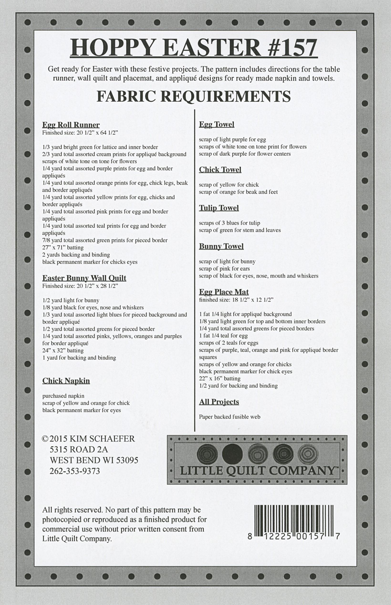 Get Ready for Easter with these festive projects. The Pattern includes directions for the table runner, wall quilt and placemat, and appliqué designs for ready made napkin and Towels.