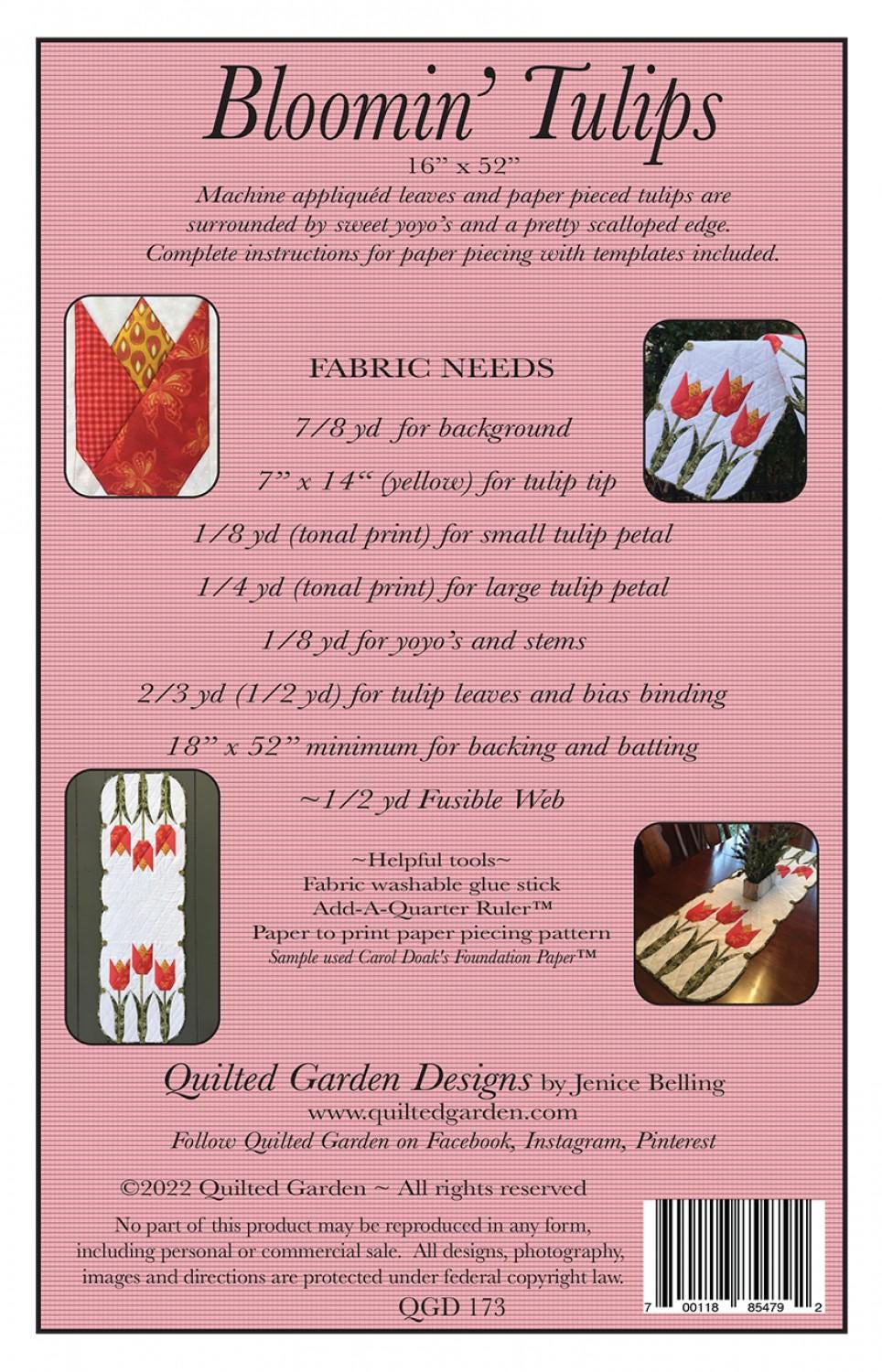 Simple paper pieced tulips, machine pieced and applique with a scalloped finish and yoyo accents. Great project for a new paper piecer and confident beginner.