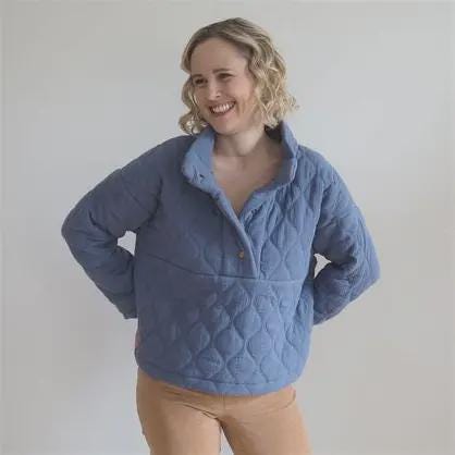 The Pogonip Pullover is the perfect layer for all your outdoor adventures! It is an unlined pullover jacket that features welt pockets, a sport collar and a snap or button half front placket. It is designed for woven or stable knit fabrics so you can have a lot of fun with your fabric choice. It looks great in everything from quilted fabrics, to fleece, to linen! Packing and carrying the Pogonip is a breeze with the fun (and optional) packable pocket with strap.