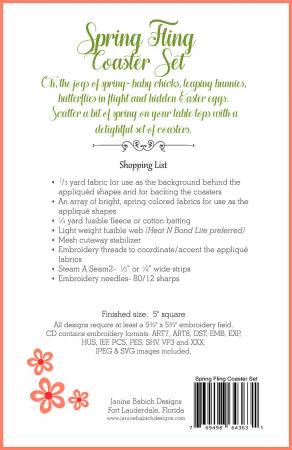 Oh, the joys of spring-baby chicks, leaping bunnies, butterflies in flight and hidden Easter eggs. Scatter a bit of spring on your table tops with this delightful set of 'Made in the Hoop' coasters. Includes embroidery formats: ART7, ART8, DST, EMB, EXP, HUS, JEF, PCS, PES, SHV, VP3 & XXX.