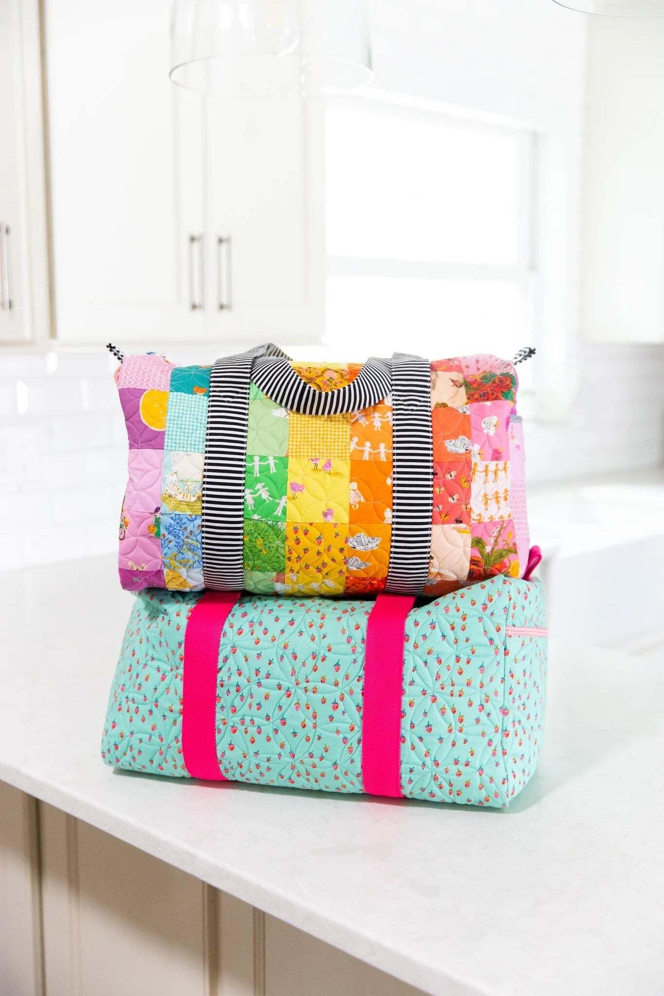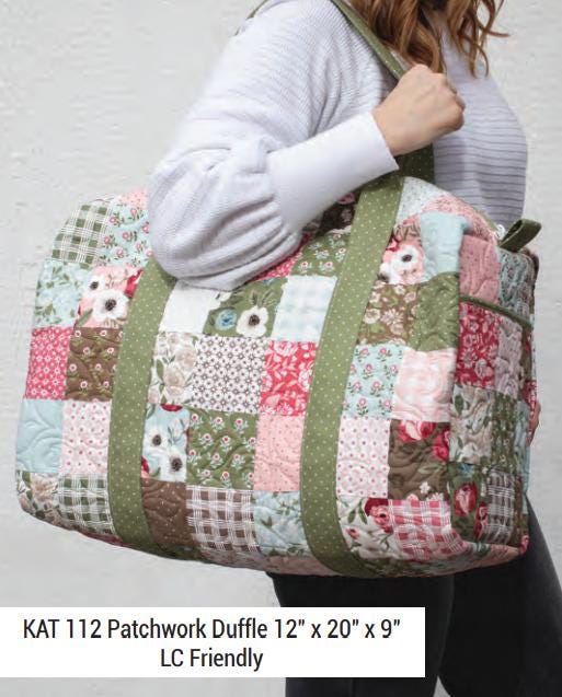 You really can carry it all with this giant duffle bag! Choose between a solid exterior fabric or scrap it up with some patchwork. There are two exterior pockets. Fill it up and take it on a trip!