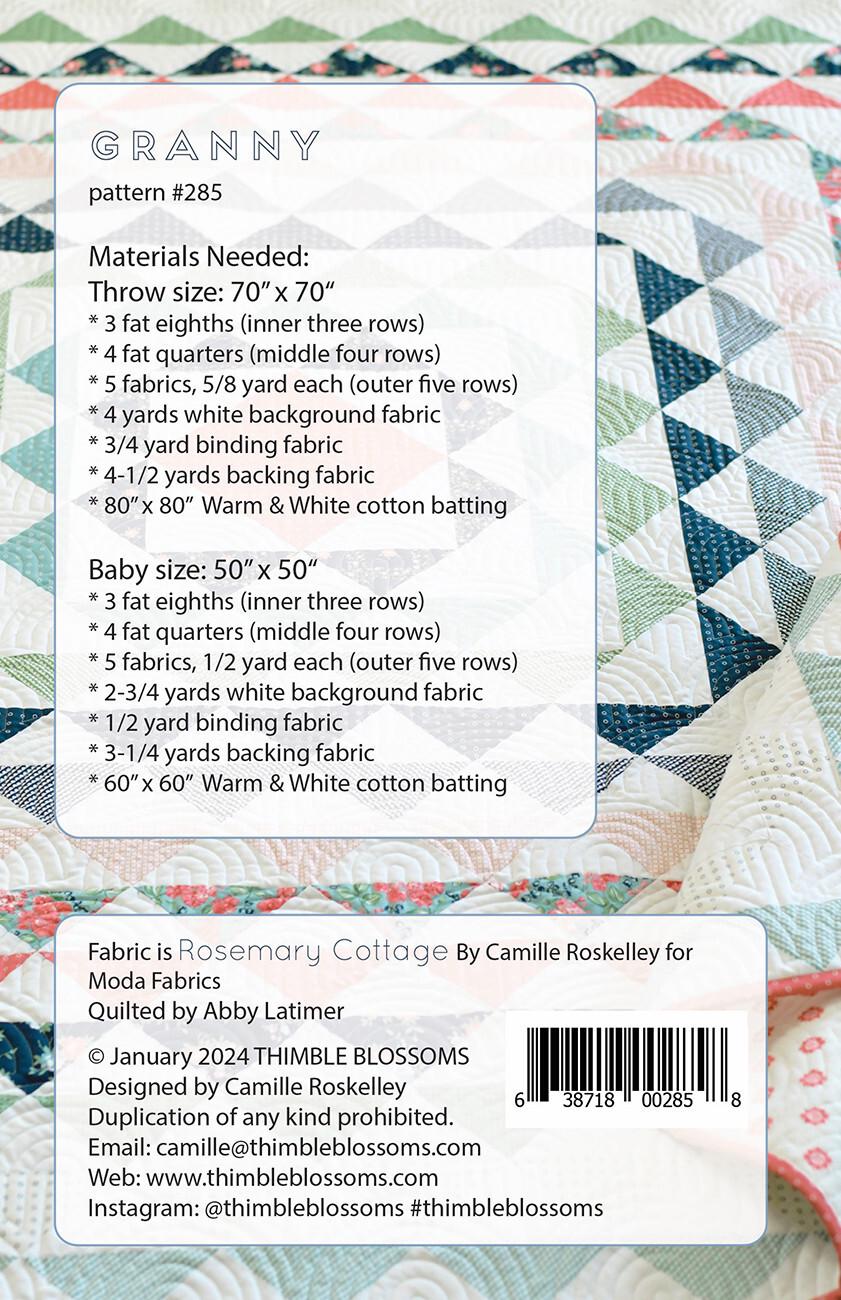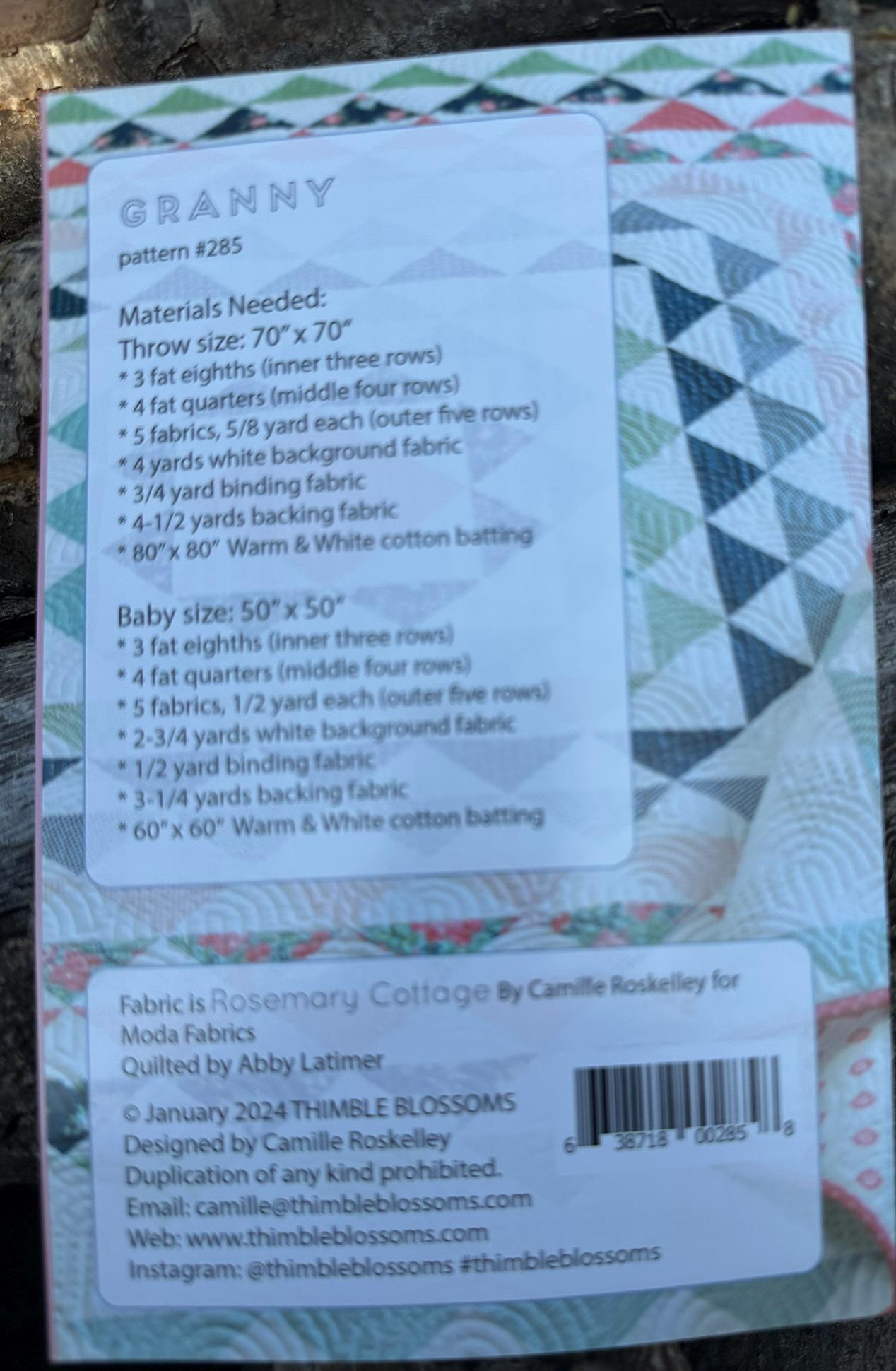 An easy to piece quilt with a granny square feel in two sizes. 50” x 50” (baby) and 70” x 70” (throw). Full color pattern. Fabric collection is Rosemary Cottage by Camille Roskelley.