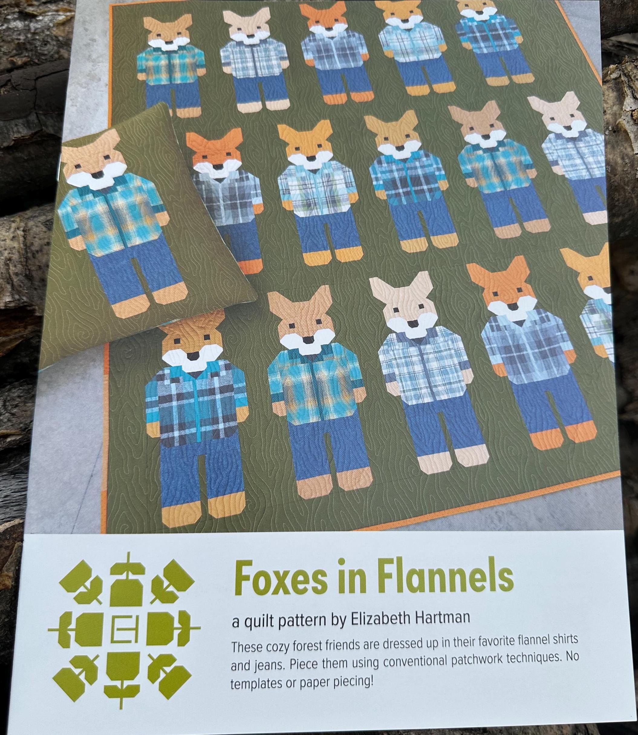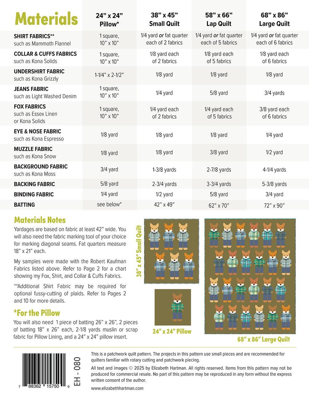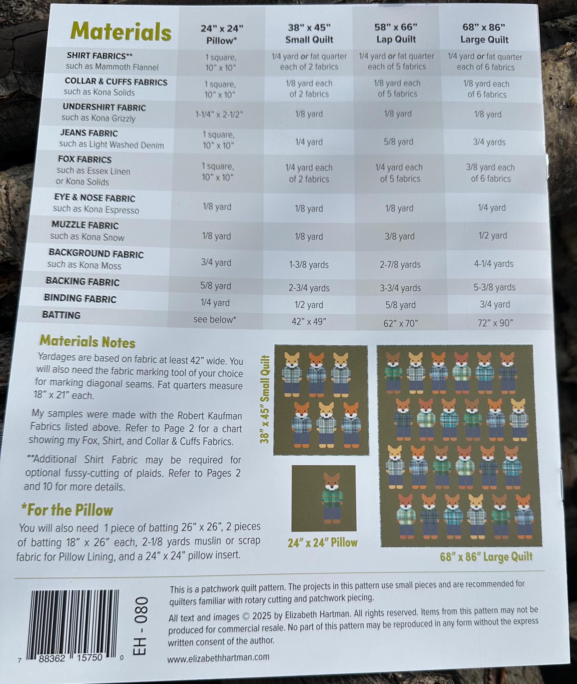 These cozy forest friends are dressed up in their favorite flannel shirts and jeans. Make them using conventional patchwork techniques. No templates or paper piecing! Pattern includes instructions for making a 24” x 24” pillow, 38” x 45” Small Quilt, 58” x 66” Lap Quilt, and 68” x 86” Large Quilt.