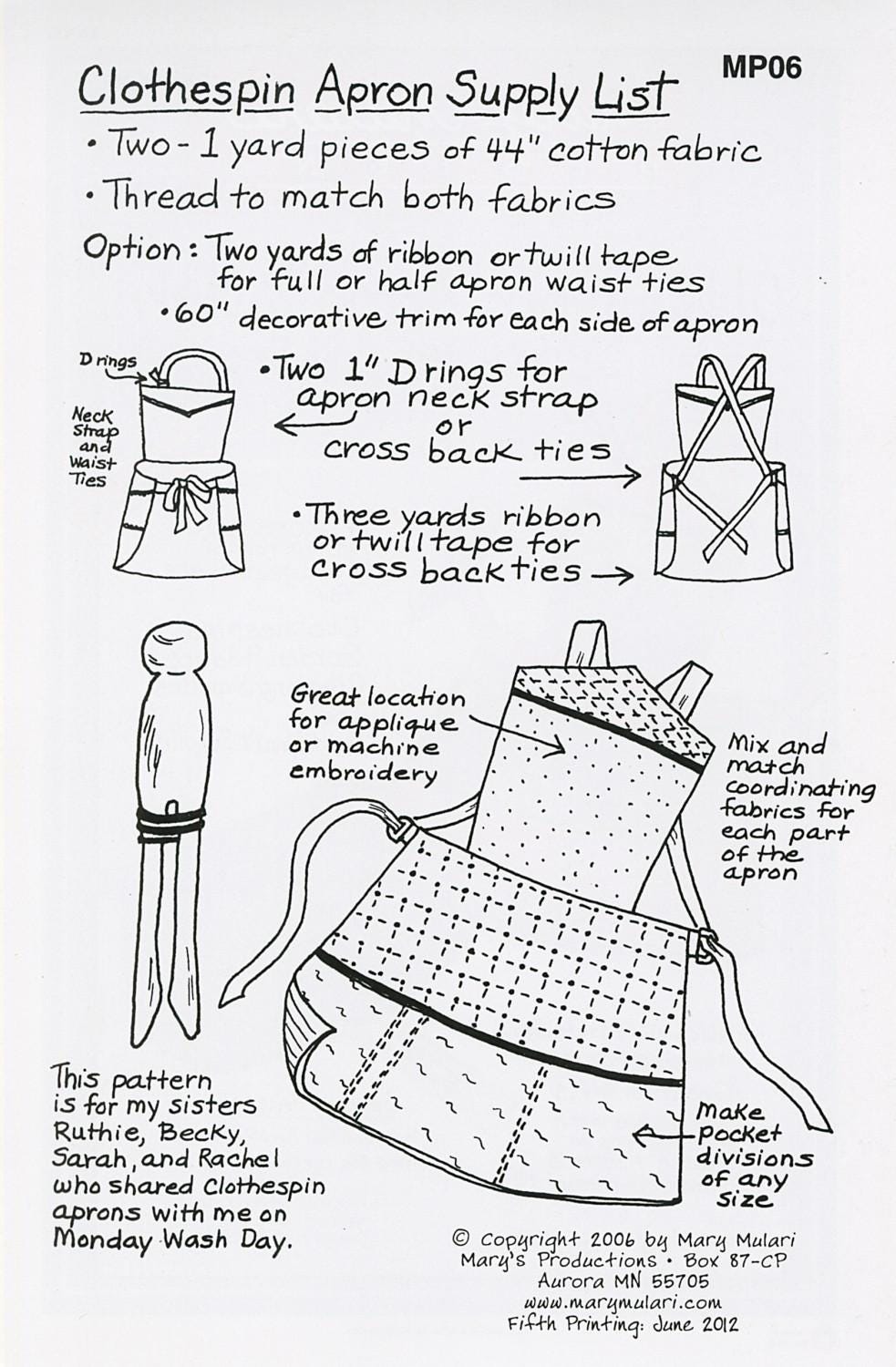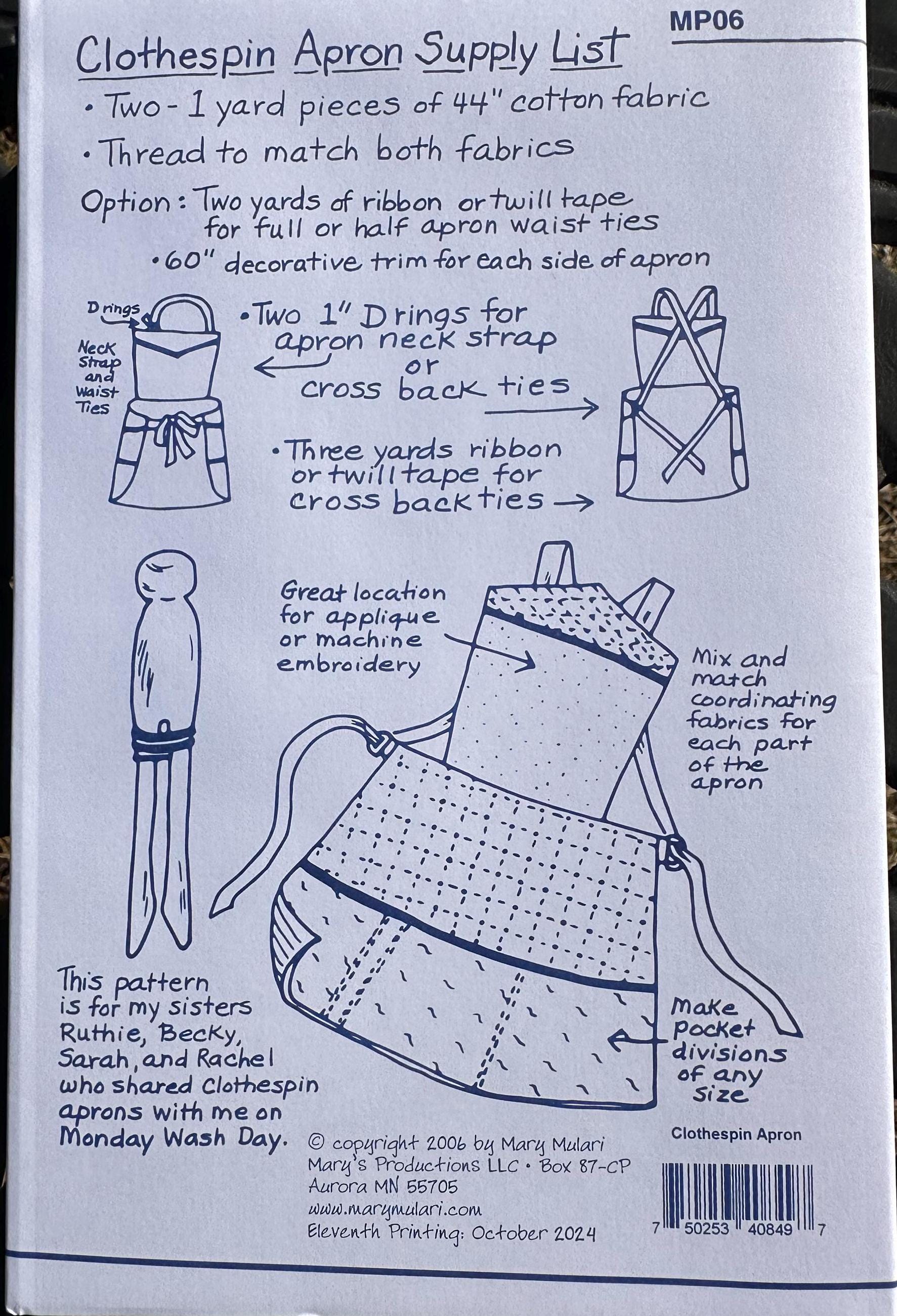 Pocketed chore apron either half apron or full. Bottom row of deep pockets holds supplies for cleaning, quilting, gardening, crafting or listening to an iPod. Double yokes on apron skirt offer extra support if pockets are full. Two 1 yd fabrics required, or mix and match coordinating fabrics and/or ribbons for ties. Two neck strap options and an open bottom edge with easy, interesting construction.
