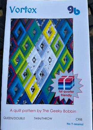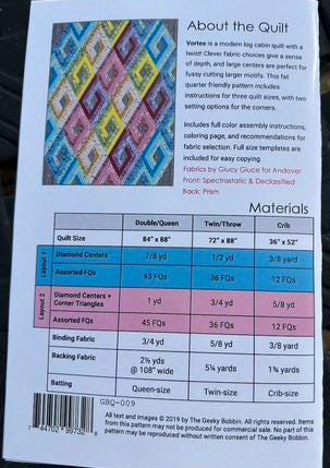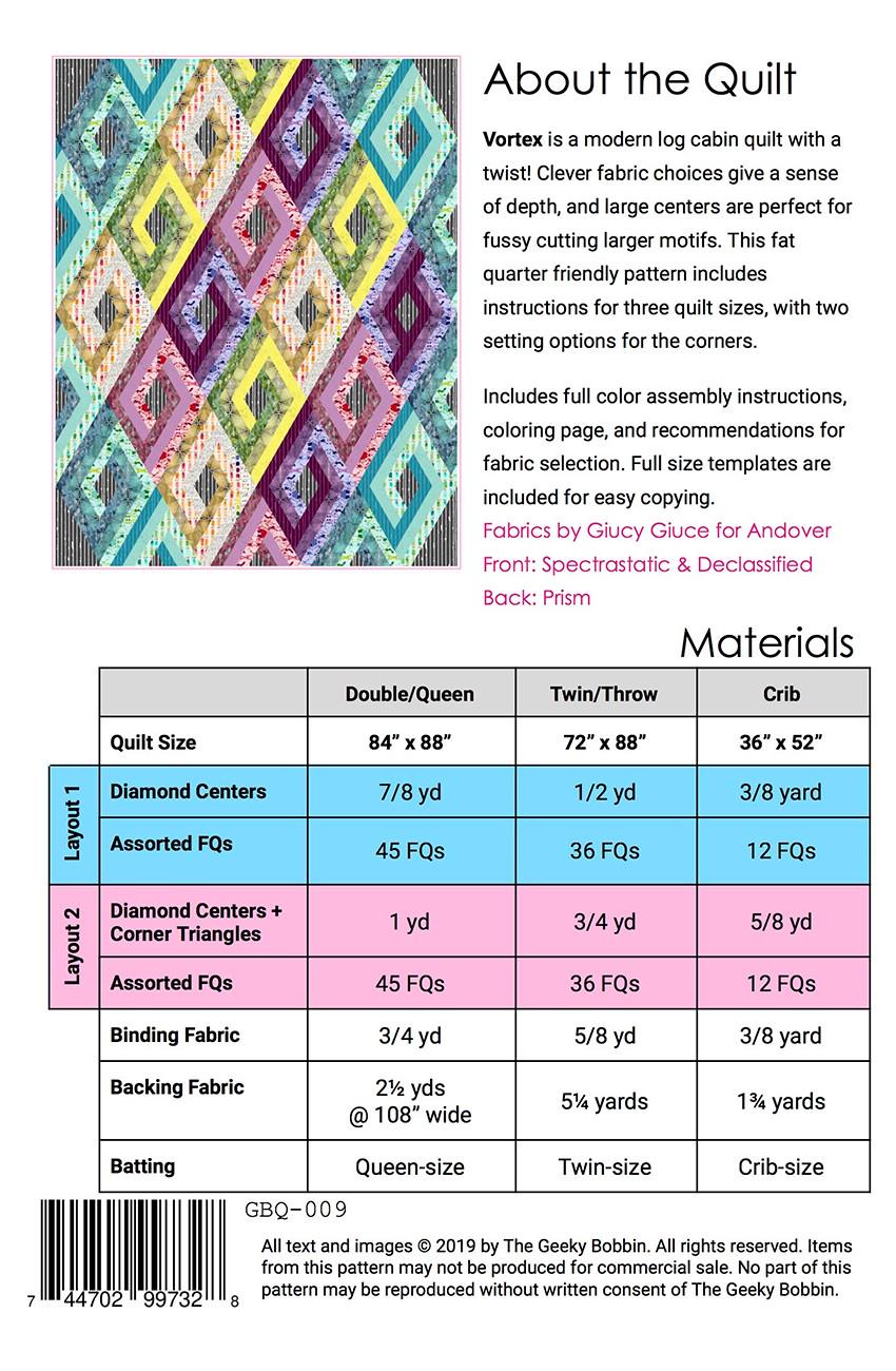 Discover the vibrant and dynamic Vortex quilt pattern, designed by The Geeky Bobbin. This modern log cabin quilt features a striking array of geometric shapes in shades of blue, green, yellow, white, and purple, creating a visually captivating design. Perfect for quilters of all skill levels, this pattern is fat quarter friendly, making fabric selection a breeze. Available in Queen/Double, Twin/Throw, and Crib sizes, the Vortex quilt pattern includes detailed instructions, full-color diagrams, and options for both rotary cutting and foundation paper piecing. The pattern uses a variety of fabric types including Diamond Centers, Assorted Fat Quarters, and binding fabric, ensuring a rich texture and depth to your finished quilt.