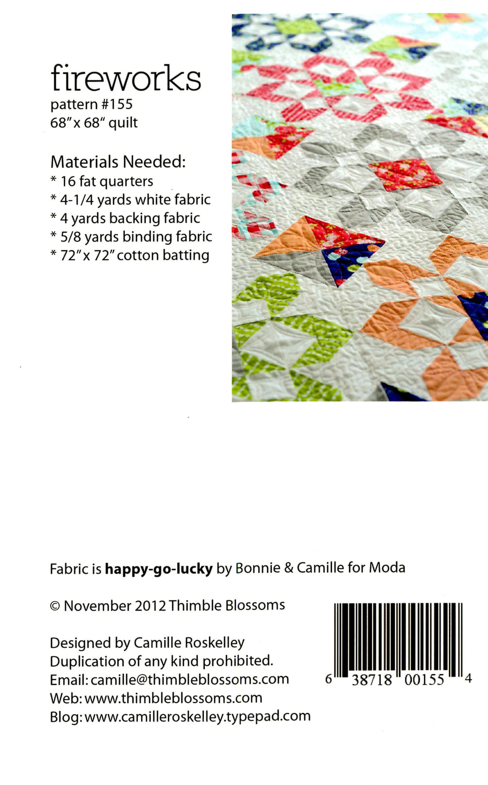 This vibrant quilt pattern, titled Fireworks, brings a burst of color and excitement to any space with its dynamic star blocks in shades of red, blue, green, and more, set against a crisp white background. Perfect for both home decor and as a stunning gift, this quilt measures 68 inches by 68 inches, making it an ideal size for a throw or wall hanging. Designed by Camille Roskelley for Thimble Blossoms, the pattern uses the cheerful 'happy-go-lucky' fabric by Bonnie & Camille for Moda, ensuring a lively and joyful aesthetic.