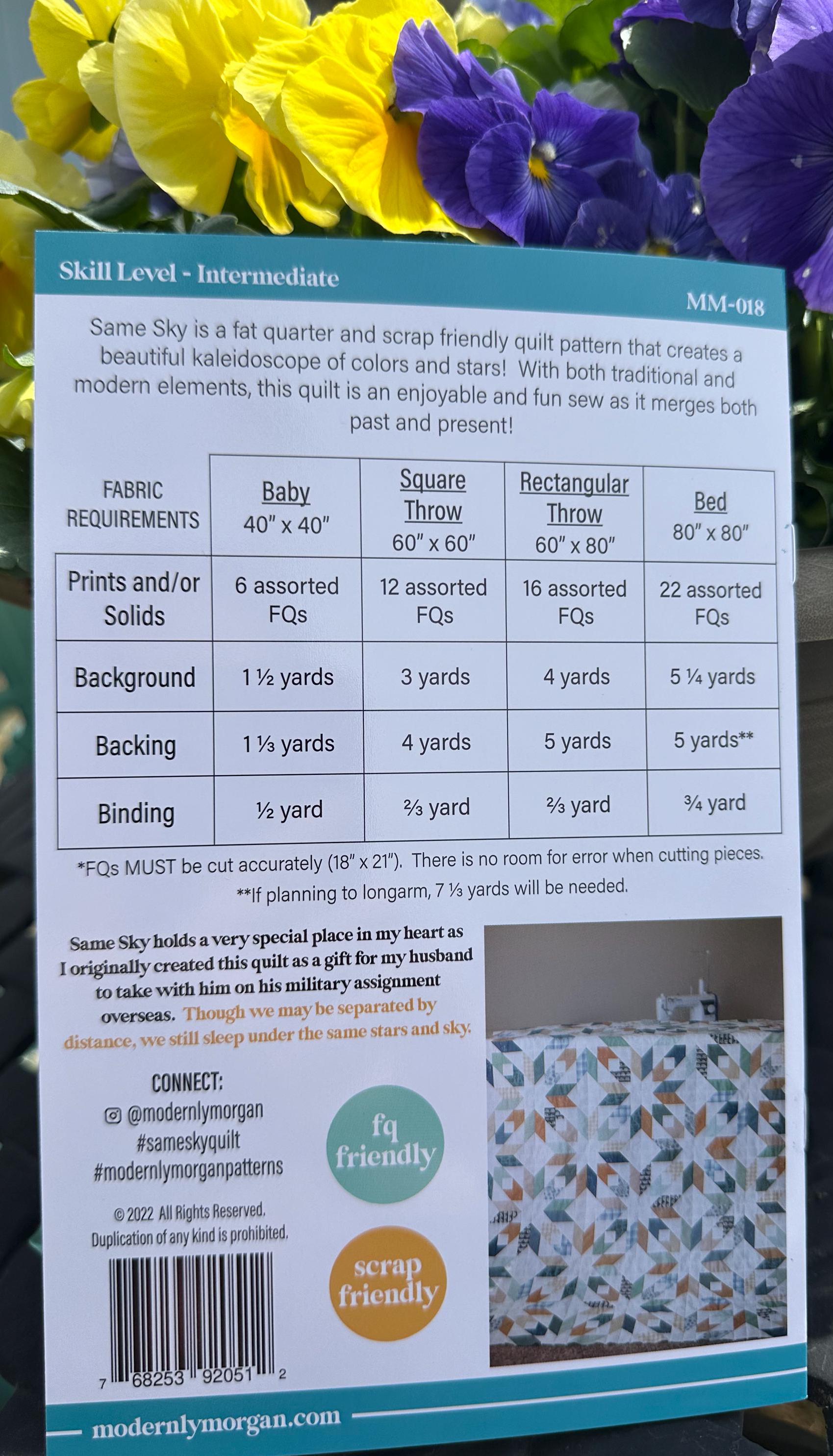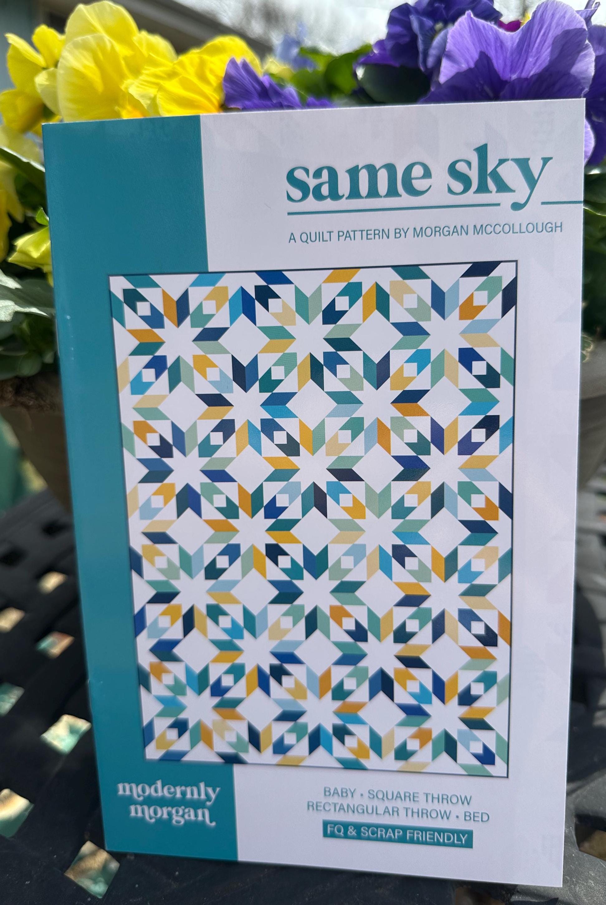 Same Sky is a fat quarter and scrap friendly quilt pattern that creates a beautiful kaleidoscope of colors and stars! With both traditional and modern elements, this quilt is an enjoyable and fun sew as it merges both past and present! Sizes: Baby 40" x 40", Square Throw 60" x 60", Rectangular Throw 60" x 80", Bed 80" x 80"
