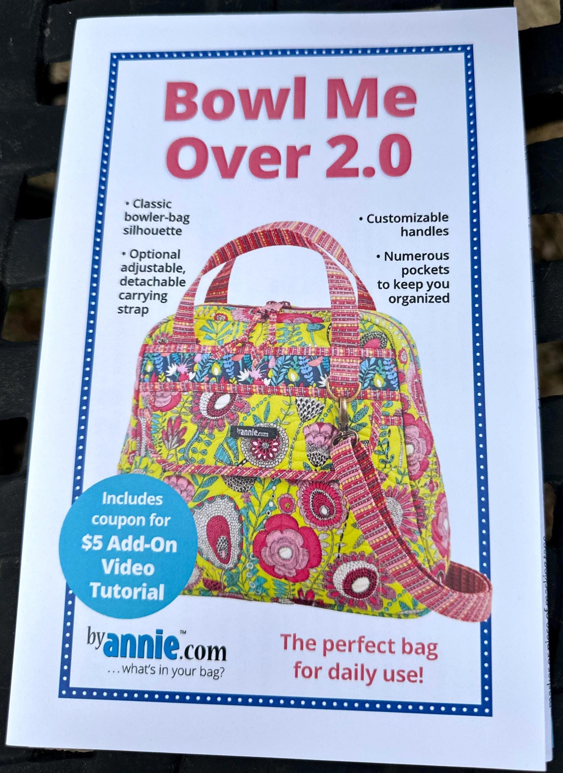This fun-to-make bag features a classic bowler silhouette with easy-to-grab handles and an adjustable, detachable carrying strap. The main compartment opens side for easy access to the bag's contents.