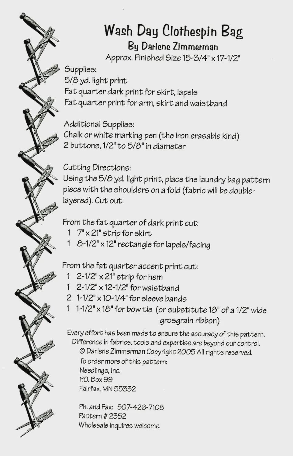 Wash Day Clothespin Bag- Sewing Pattern- From Needlings, Inc.- By Zimmerman, Darlene-DZ2352