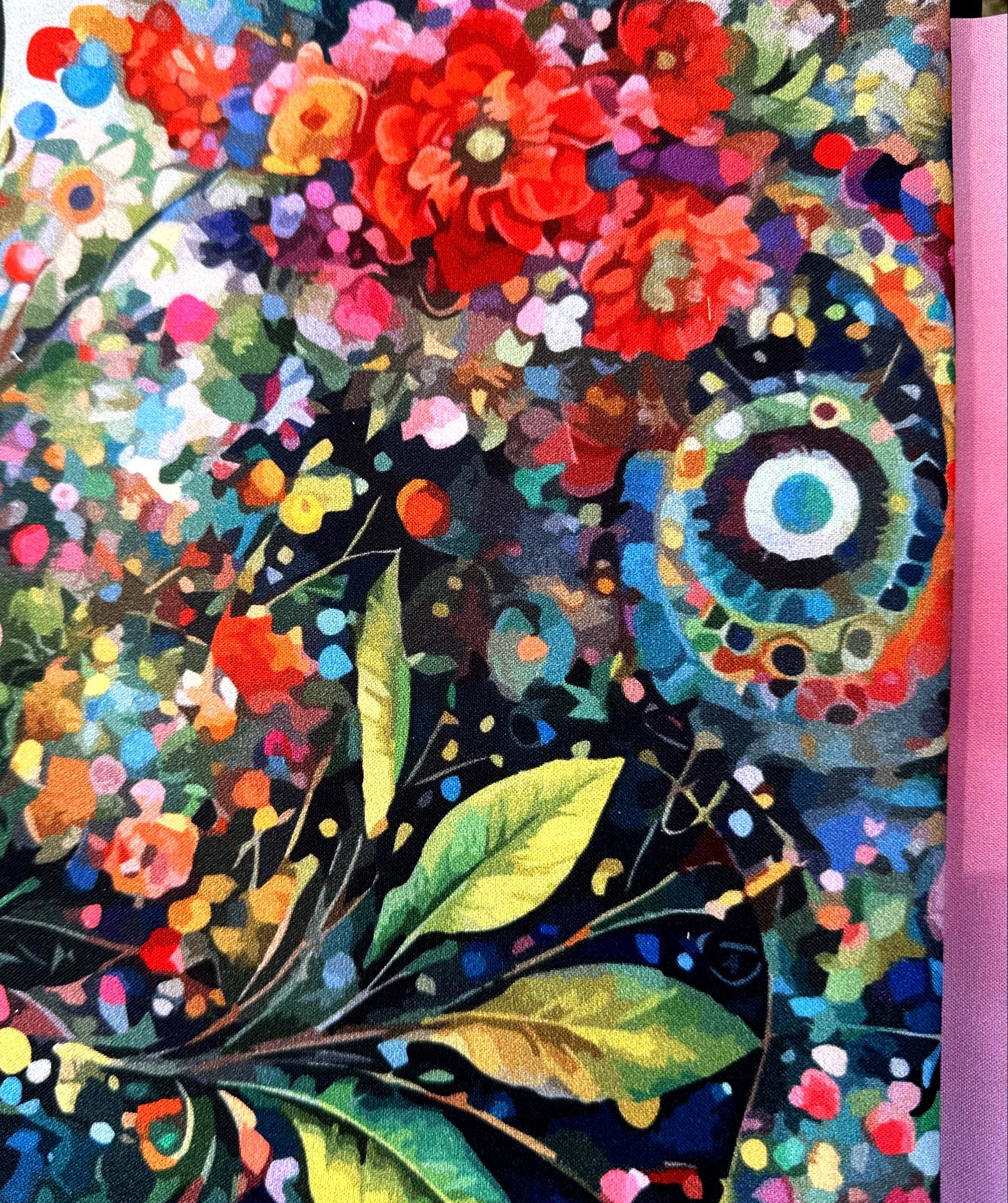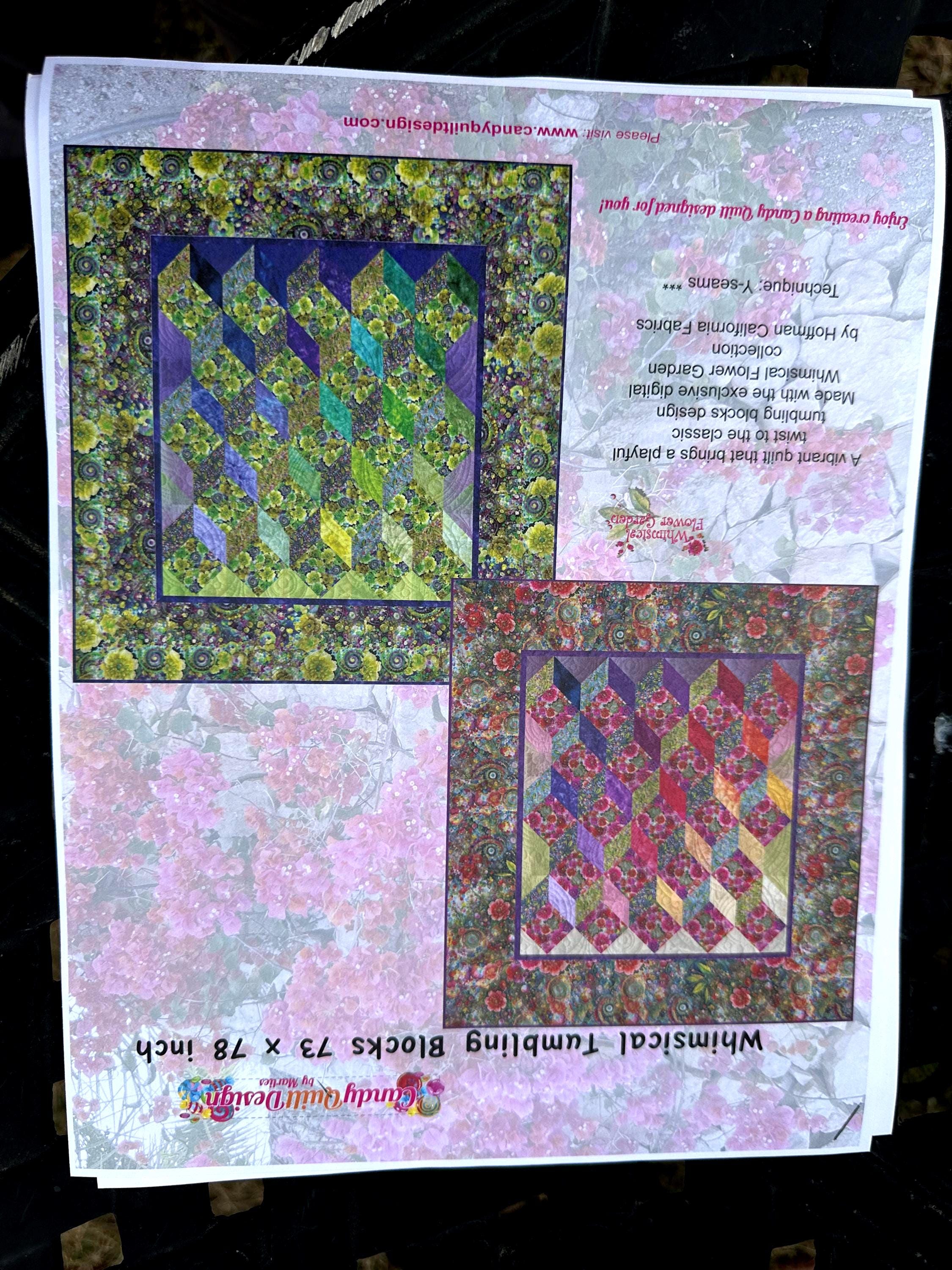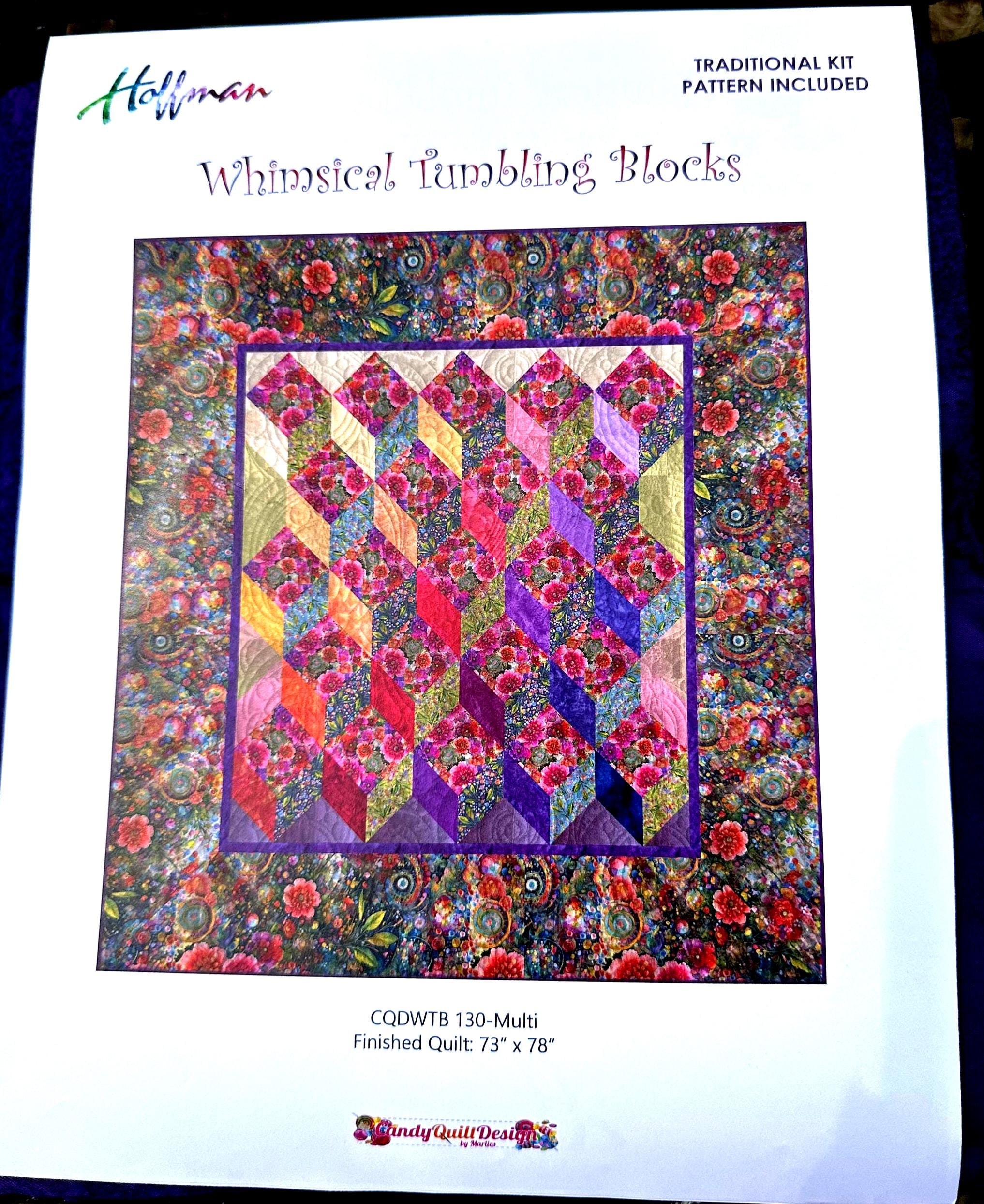 Design Features: This quilt incorporates the Whimsical Flower Garden digital print collection, providing a colorful and lively aesthetic that enhances the traditional tumbling block pattern. The design is characterized by its vibrant colors and dynamic patterns, bringing an eclectic touch to home décor.