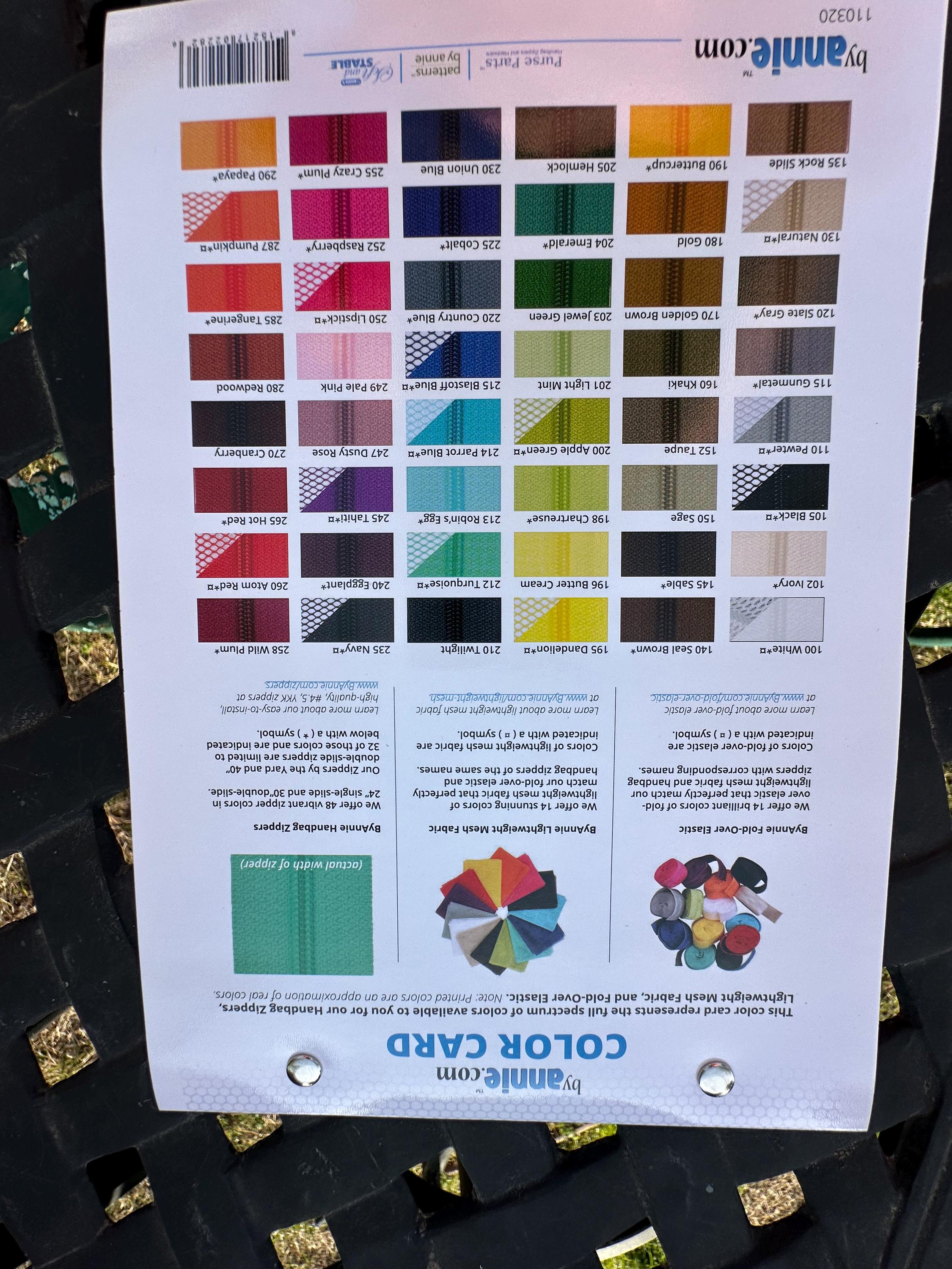 This mesh sample pack includes all fourteen of our mesh colors riveted to a sturdy card. Each sample piece is 6in x 8in. The rivets are built to hold up to wear and tear, while still making it easy to store the samples afterward. The backing card is printed with a zipper color card to help you choose zippers.