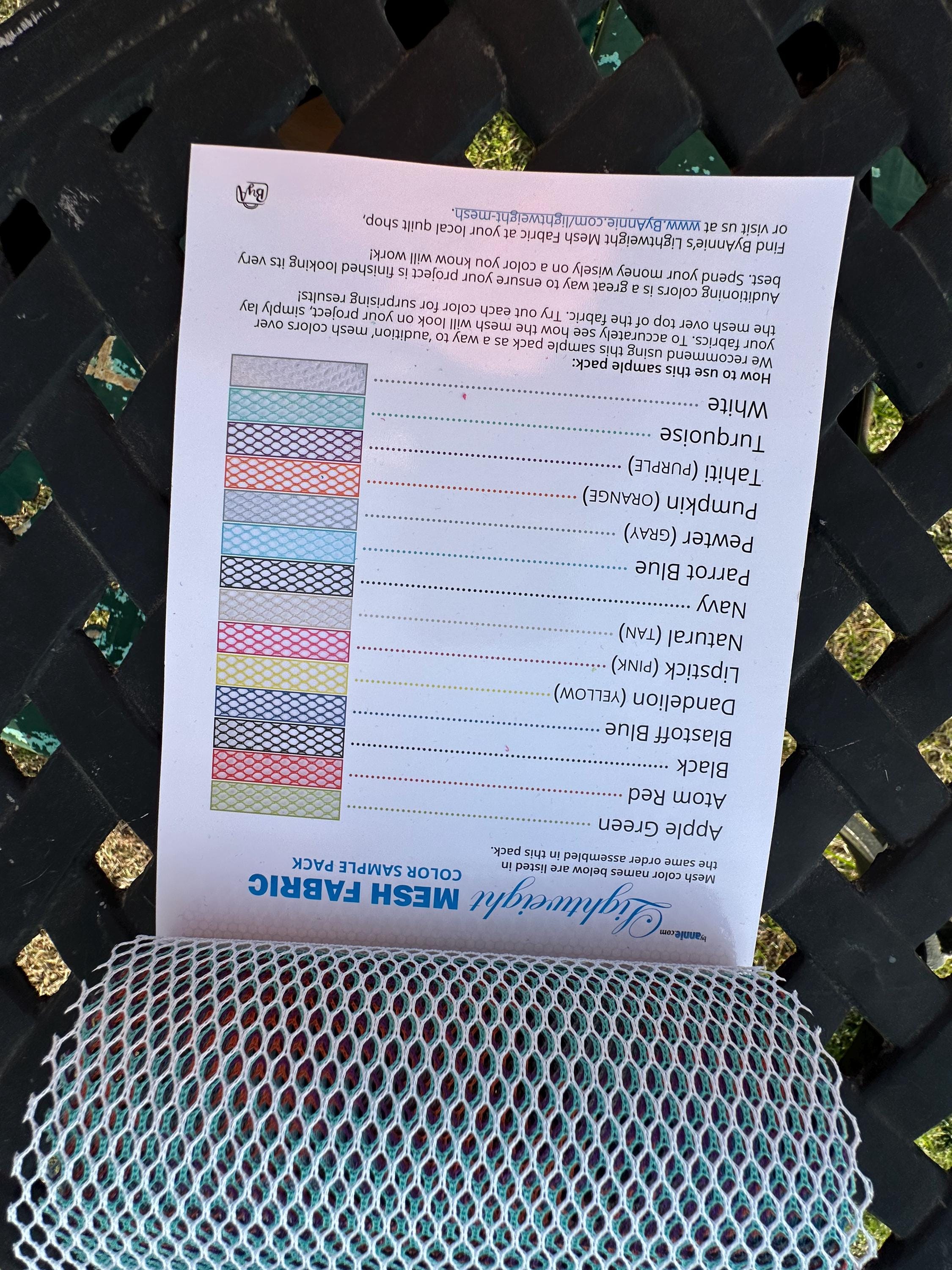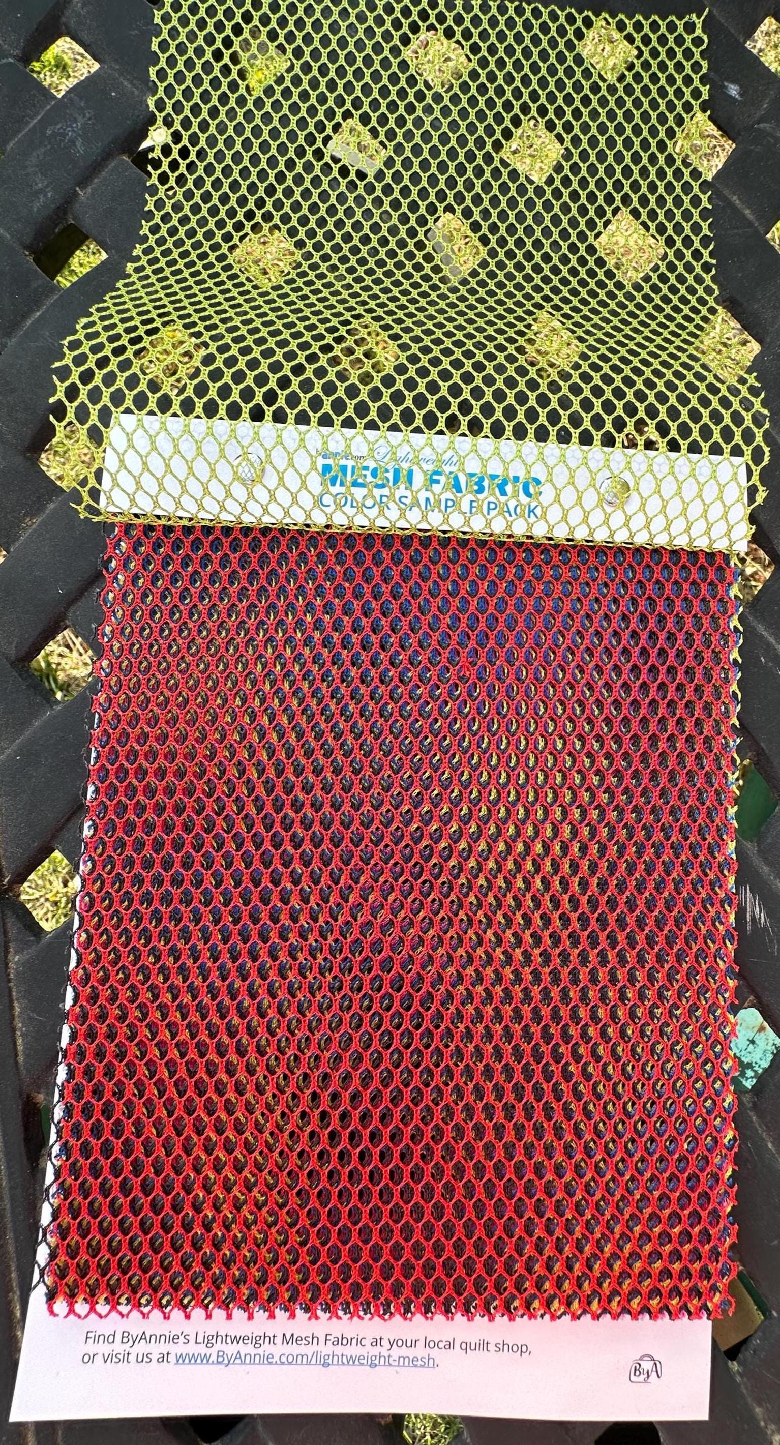 Use this sample pack to quickly and easily audition all of our colors of mesh on your fabrics before you start cutting (or even buying). You'll love being able to see how the colors coordinate prior to sewing your project. It's always fun to see how the mesh colors interact with different fabrics. Since the mesh itself is so open, mesh colors often play well with unexpected fabrics!