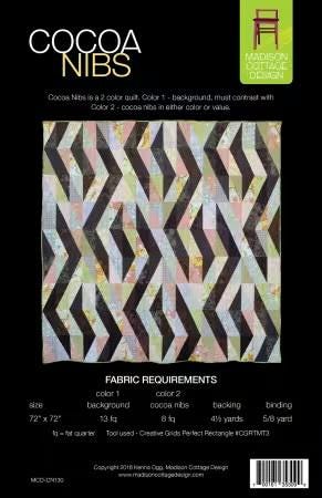 72" x 72". Cocoa Nibs is a 2 color quilt. Color 1 - background must contrast with Color 2 - cocoa nibs in either color or value. Dramatic and fast, fat quarter efficient. Tool used was Creative Grids Perfect Rectangle CGRTMT3.