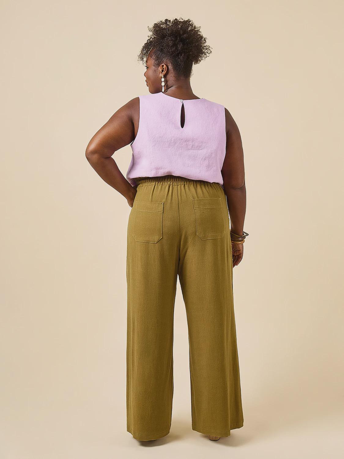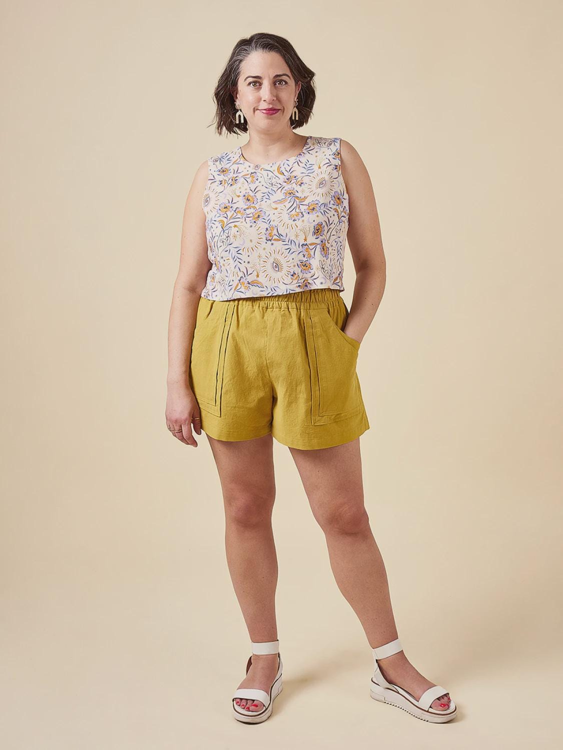 The Sepia Pants and Shorts are a clever design that blend style and comfort. Functional double pockets in the front are sewn to create a floating effect, with additional topstitched pockets in the back. A traditional elastic waistband is elevated with a fluted paperbag edge and optional drawstring. View A is a barrel legged pant ending at the ankle, shaped with darts at the knee and hem. View B is a wide legged, full length pant. View C is a short ending at mid-thigh.