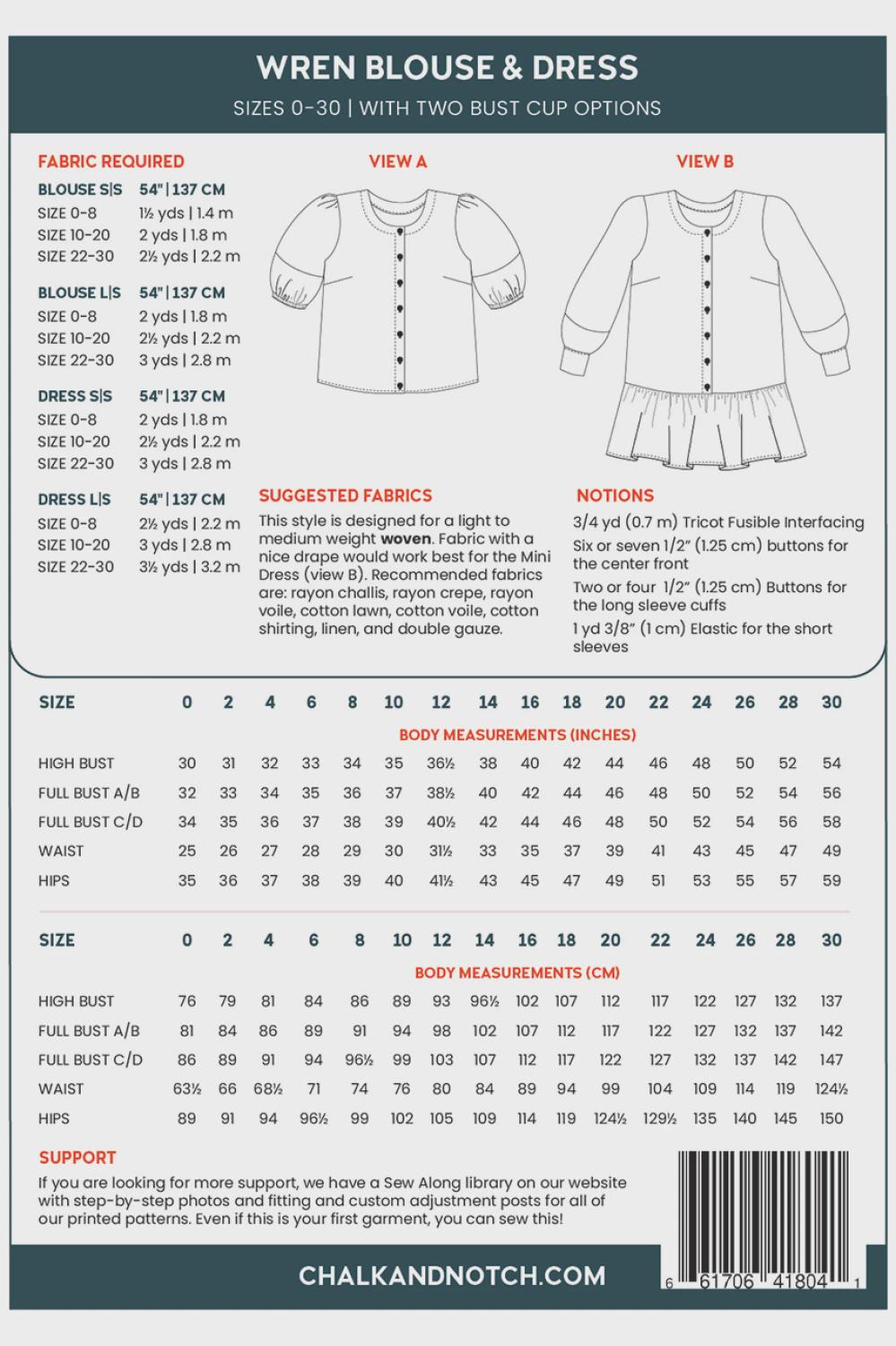 Wren Blouse and Dress - Sewing Pattern - By Chalk + Nitch Patterns - Sizes 0 - 30 / With Two Bust Cup Options
