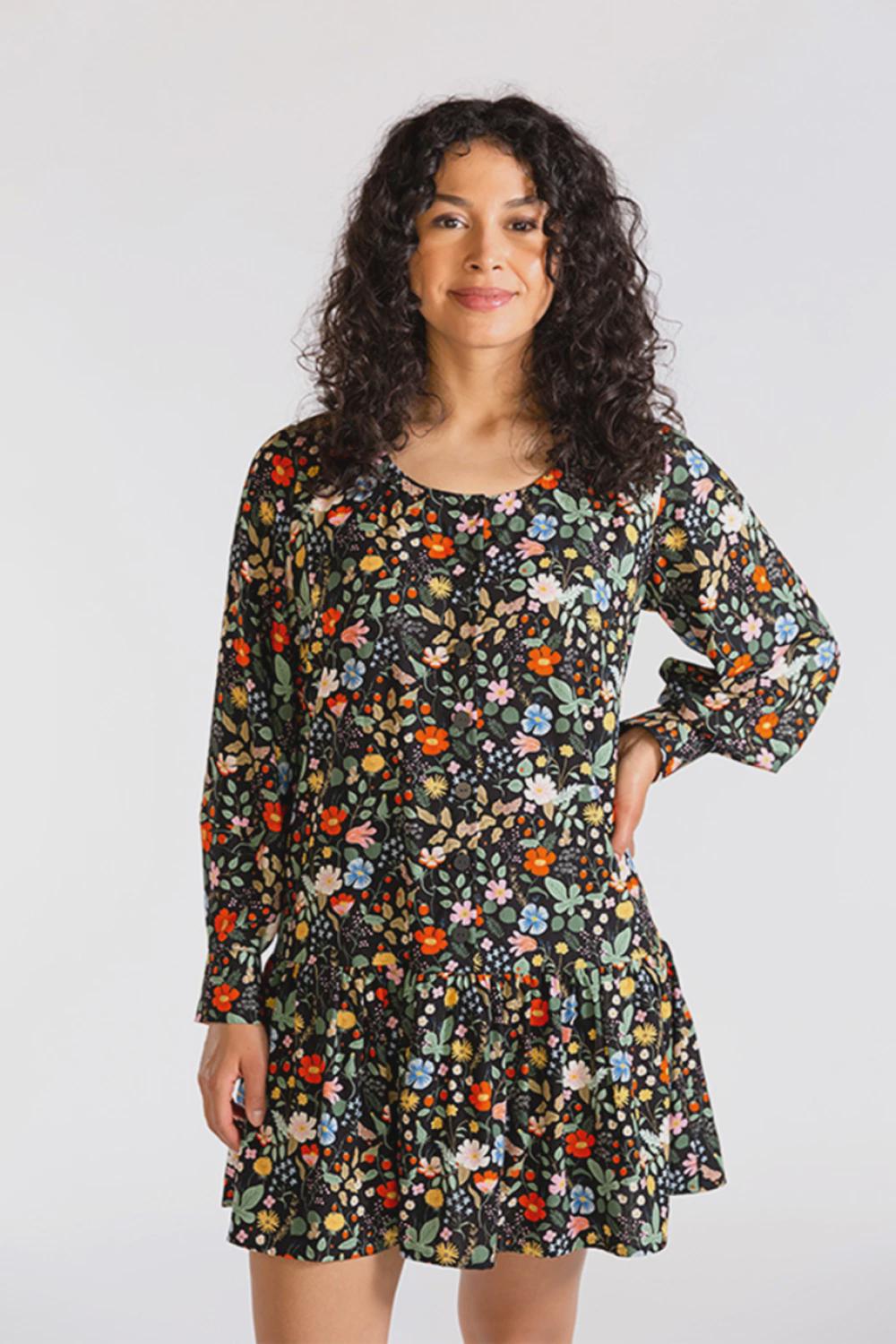 The Wren pattern is a button-front blouse and a mini dress. The mini dress has a dropped waist with a gathered skirt and is loose through the waist and hips. There are two statement sleeve options. A short sleeve with a puff cap and an elastic hem and a long sleeve with a cuff.