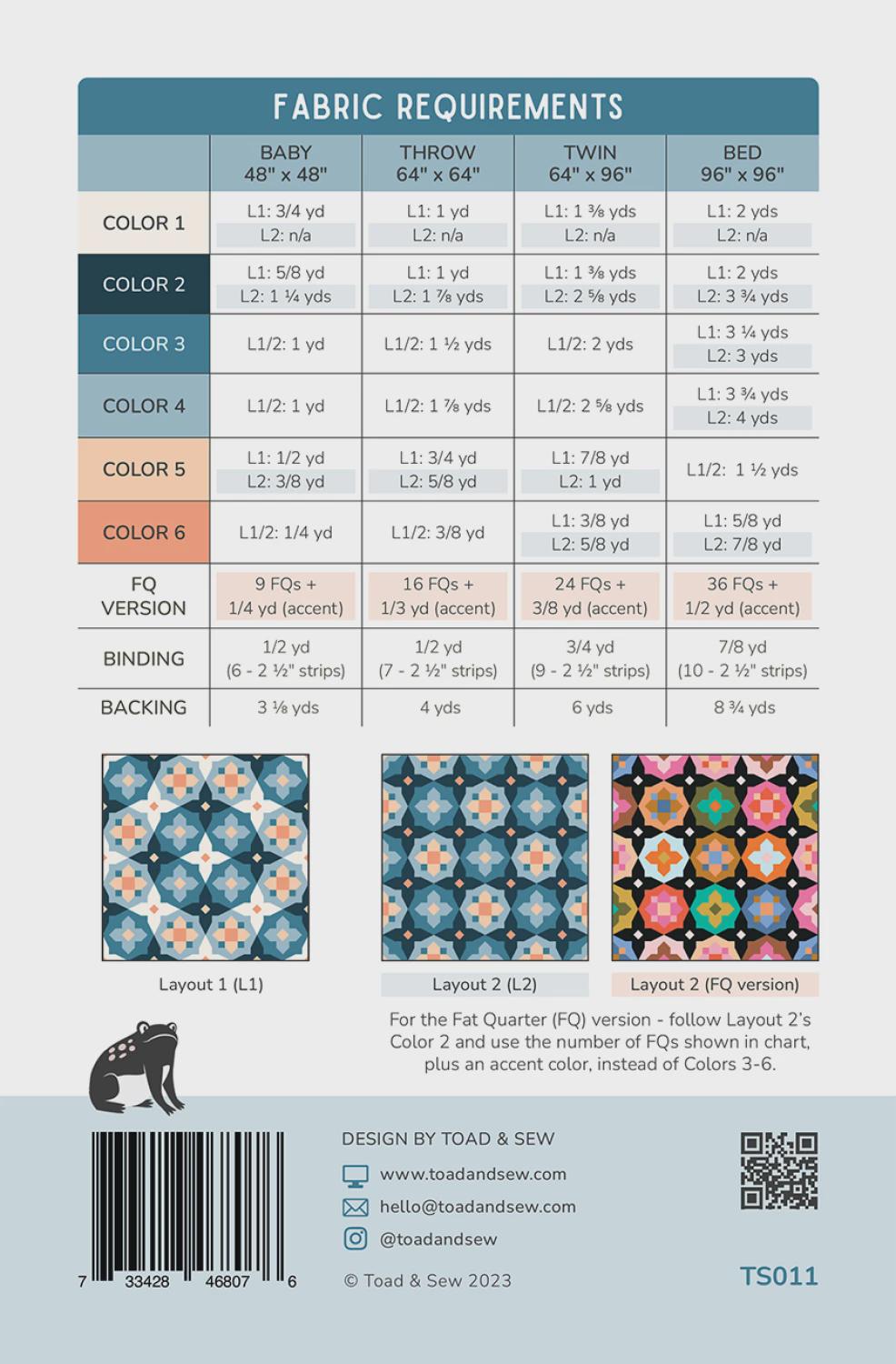 The Garden Glow Quilt is a pattern written by Taylor Krz of Toad & Sew. The Garden Glow Quilt is a spin-off design inspired by one of Toad & Sew's best-selling and personal favorite patterns, the Sky Cabin Quilt. She wanted to push her creativity further by creating a block-based design that is fat-quarter friendly, drawing inspiration from my adoration for tile floors and intricate mosaics. This pattern offers various layout and size options, allowing you ample choices to personalize it according to your preferences. It is suitable for intermediate quilters due to the importance of sewing precision using both a 1/4" and scant seam allowance.