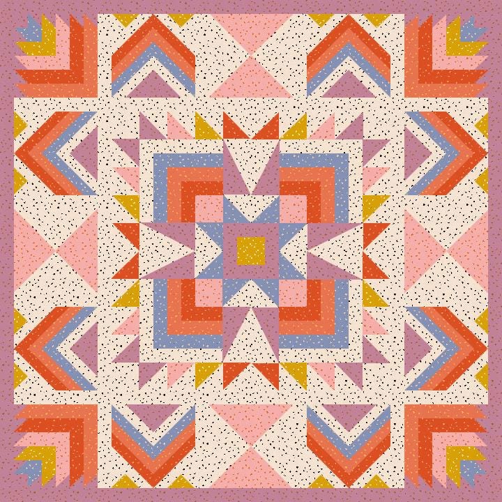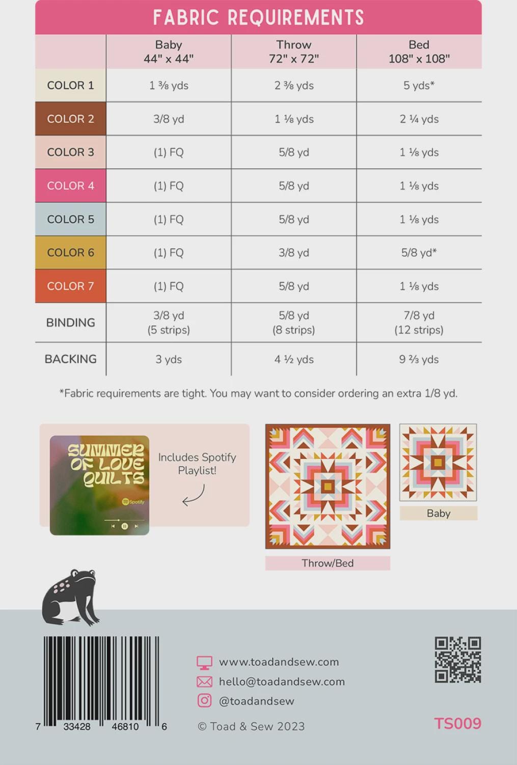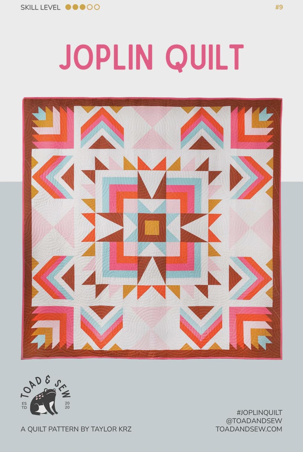 The Joplin Quilt is an original pattern design by Taylor Krz of Toad & Sew. This pattern is rated for the intermediate sewer and assumes that the quilter understands basic quilting knowledge and can keep a consistent 1/4" seam allowance. The pattern center around a block made up of many traditional elements but has been given a modern, dramatic, and folk flair. The design is a nod to my favorite female musician of the late 60's. Sizes Joplin: Baby: 44” x 44” Throw: 72” x 72” Bed: 108” x 108"