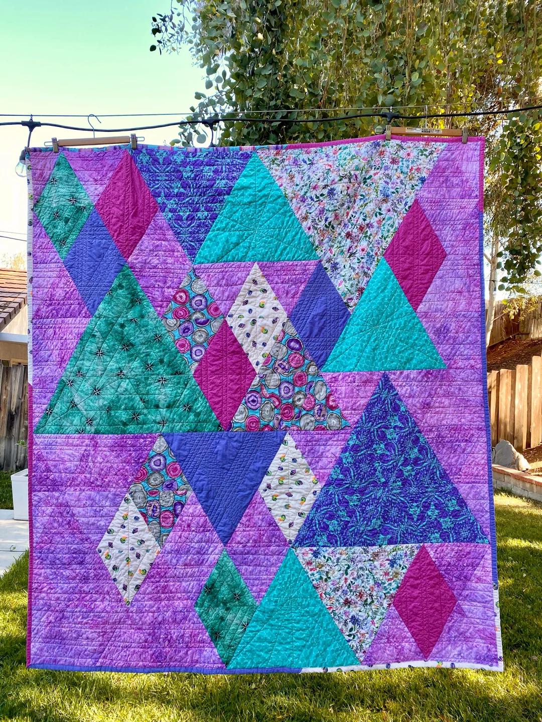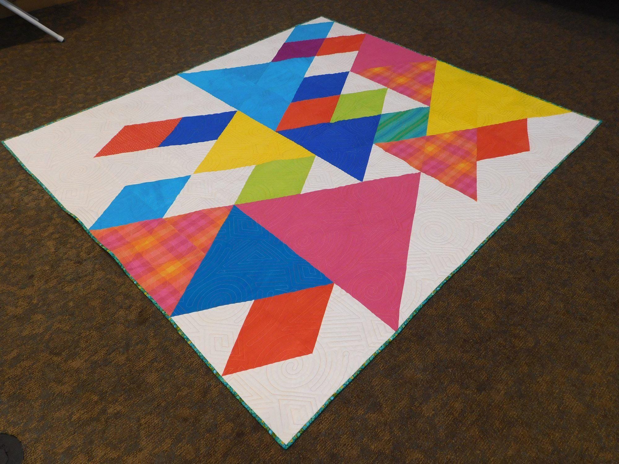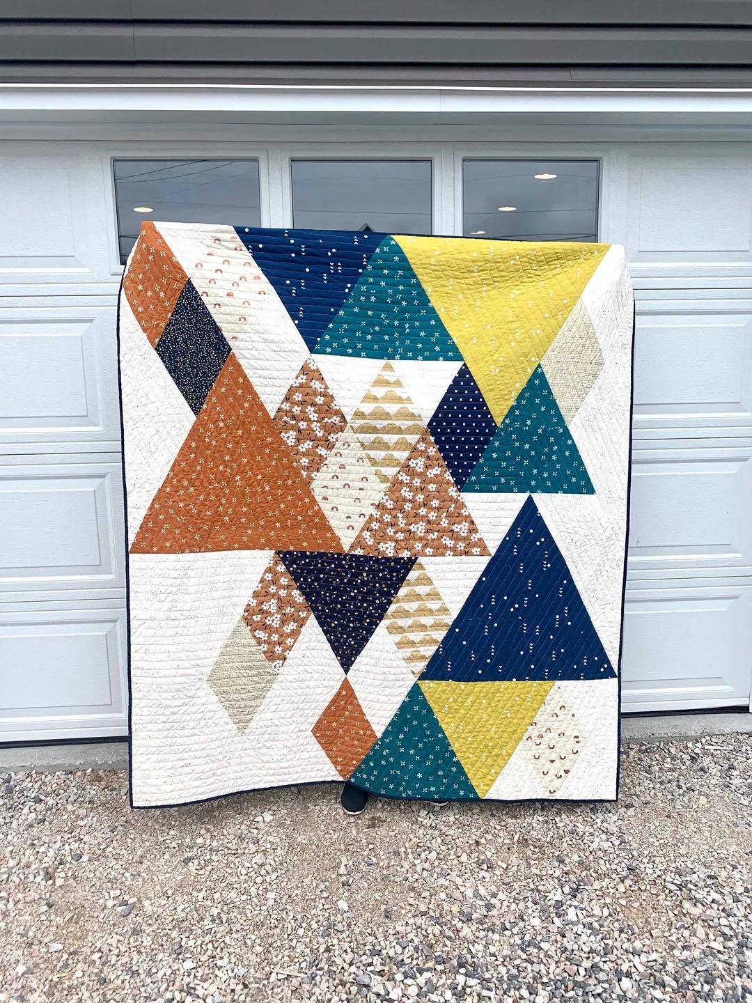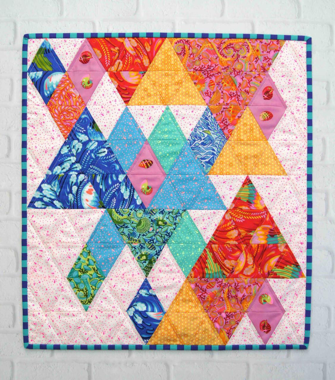 Make a Bright and Bold statement with this Triangle Quilt. For all those modern Quilt lovers then this quilt will be perfect for Solids or your favourite Prints in this geometric fun design. The Quilt pattern features both the Large Quilt size along with a fun Mini Quilt included as well. The pattern includes List of Fabric requirements Cutting Instructions Sewing Instructions Pressing Tips Layout and Assembly instructions Cutting Tags Acrylic templates available seperately Quilt Finished Size – 62½in x 72½in (159cm x 184cm) Mini Quilt Finished Size – 20½in x 22½in (52cm x 57cm)