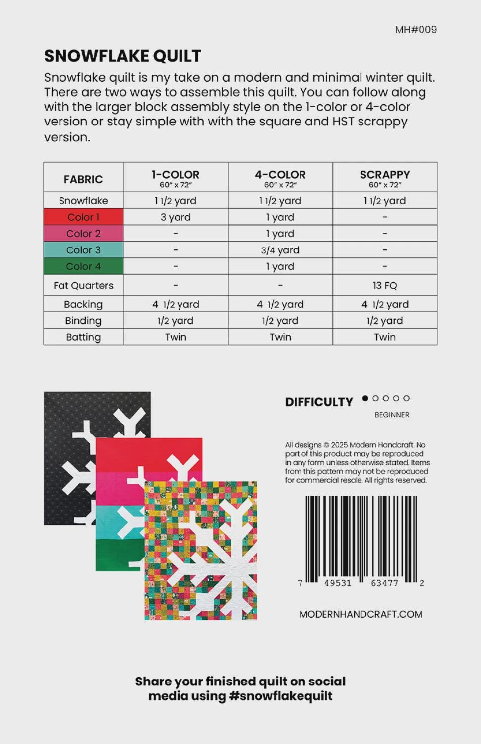 Snowflake Quilt is my take on a modern and minimal winter quilt. There are two ways to assemble this quilt. You can follow along with the larger block assembly style on the 1-color or 4-color version or stay simple with the square and HST scrappy version. Finished size 60in x 72in.