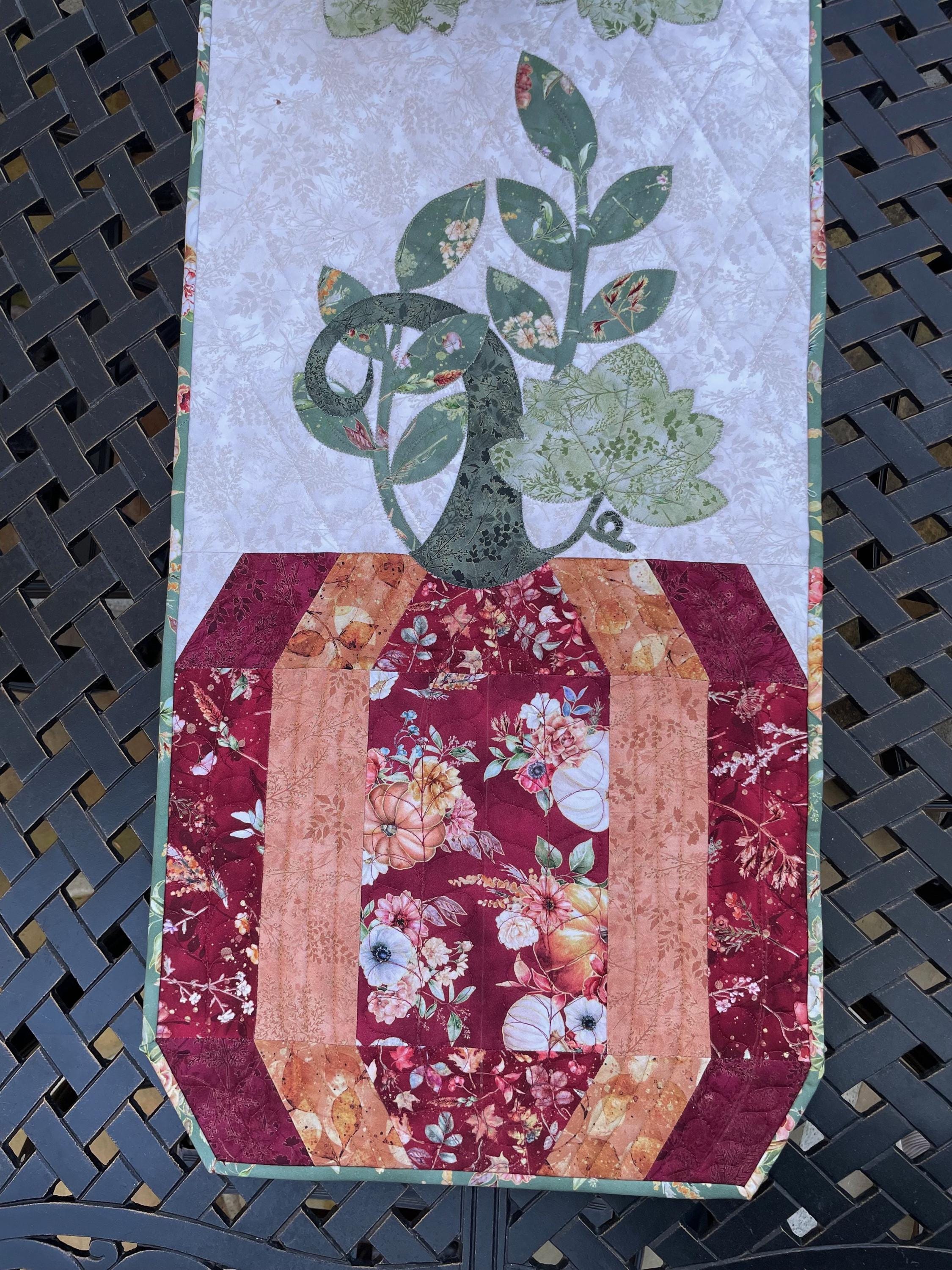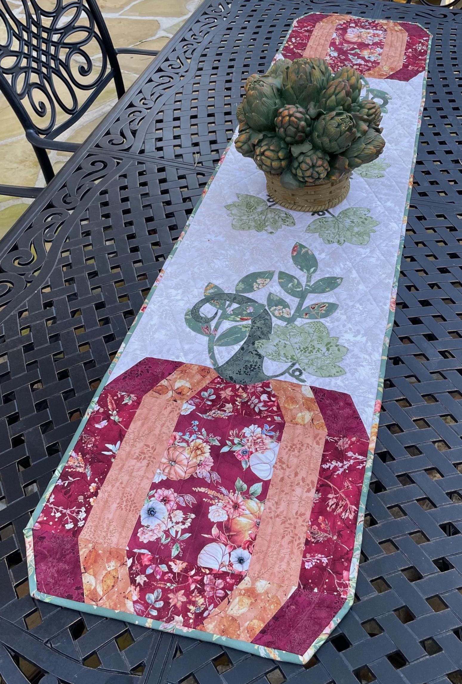 Pattern for a great table runner to show off your fall decor. Traditional piecing combined with template cut sections all come together with raw edge machine appliquéd stems, leaves and vines. Pretty stacked flowers and leaves show off their beauty in the center. Directions include all templates plus options for the wide or narrow center. Sure to be a show stopper, this topper is perfect for any decorating style.