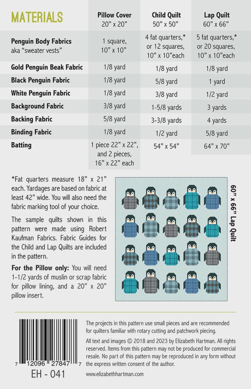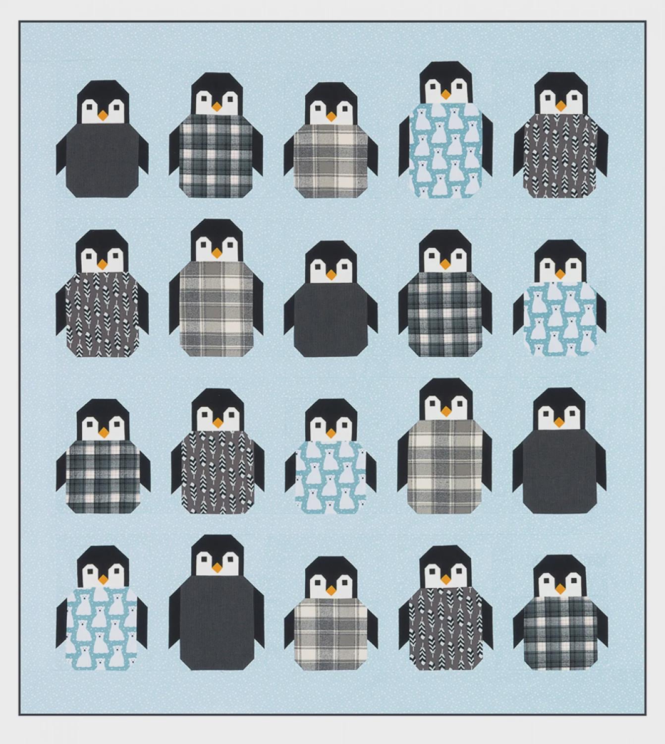 Patchwork penguin quilt pattern featuring 60in x 66in lap quilt, 50in x 50in child quilt, and 20in x 20in pillow projects. All projects are made with conventional patchwork techniques using fat quarters or precut 10in squares. No templates or paper piecing.