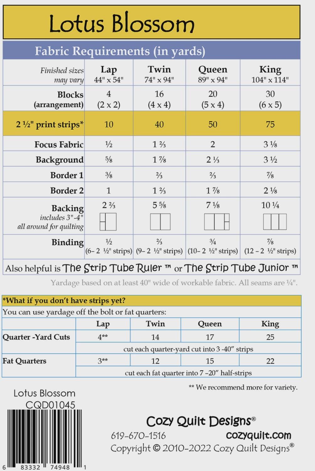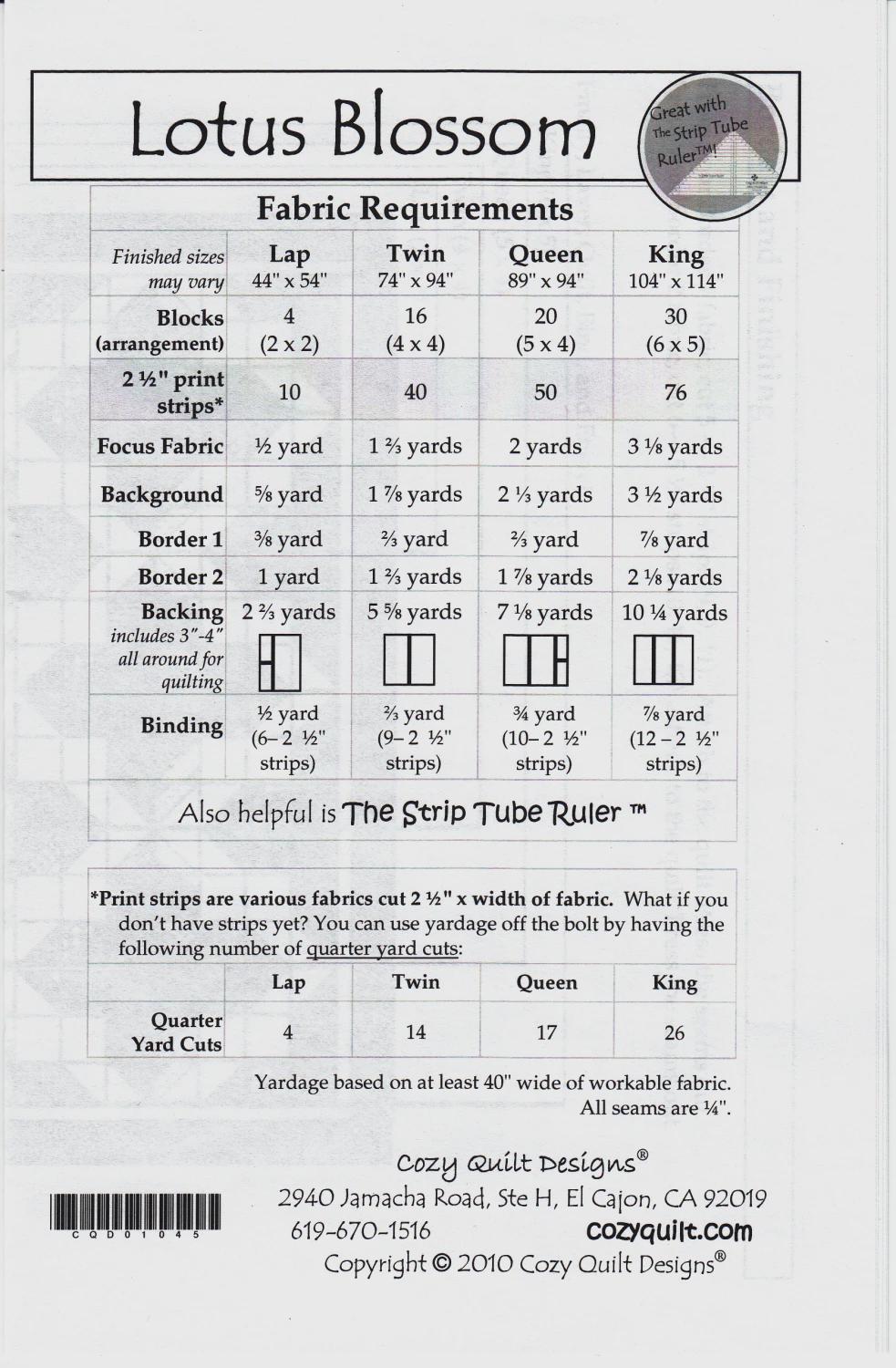 Looking almost like a cathedral window, Lotus blossom is both striking and simple. Like all Cozy Strip Club patterns, it starts with 2-1/2in strips. With this one you can use our Strip Tube Ruler to make it even easier.