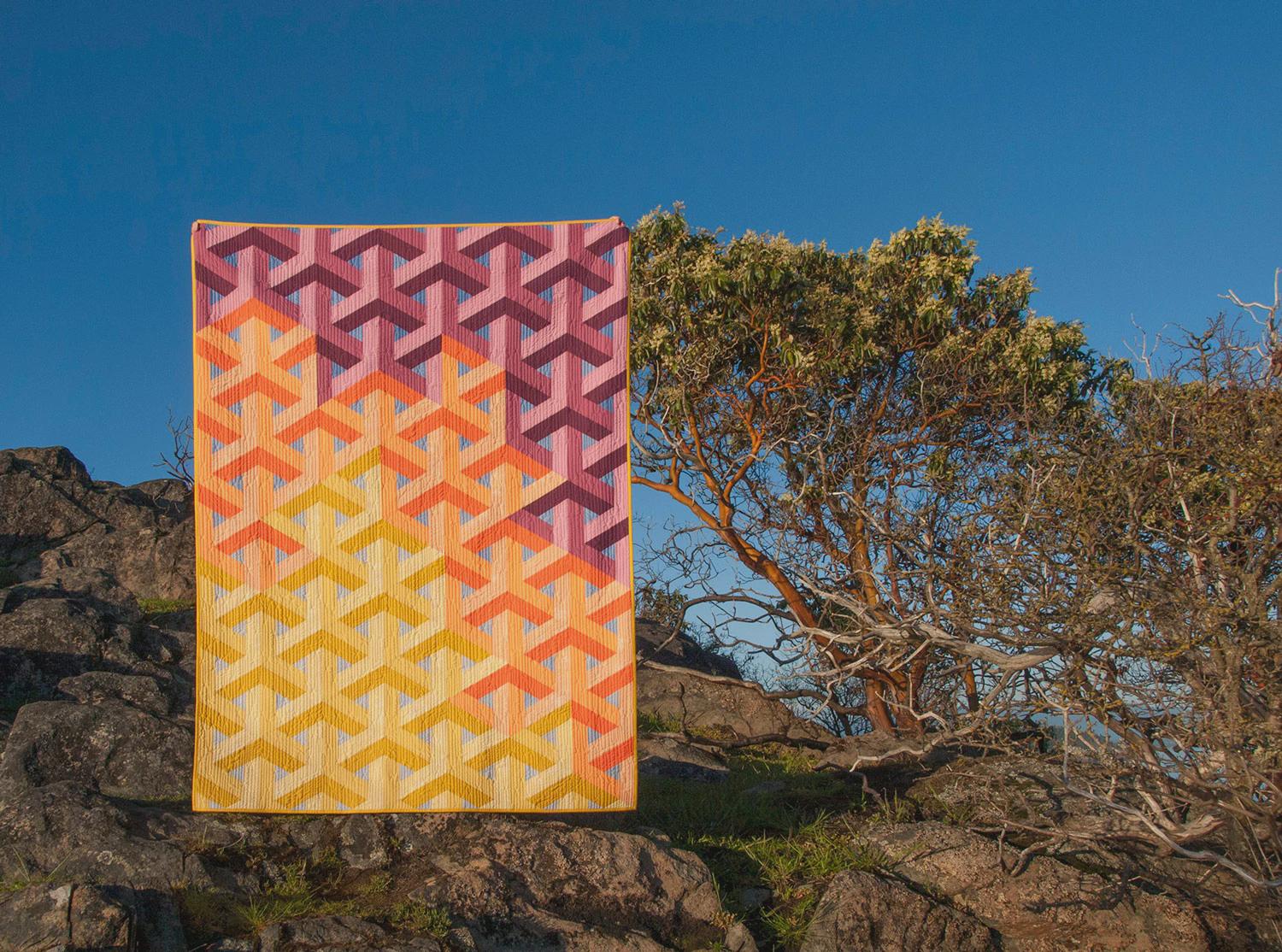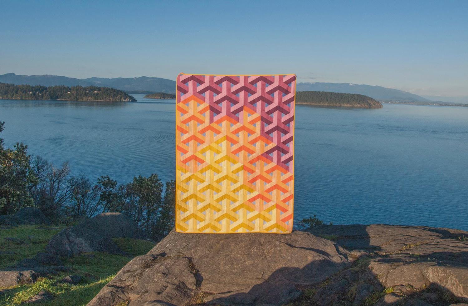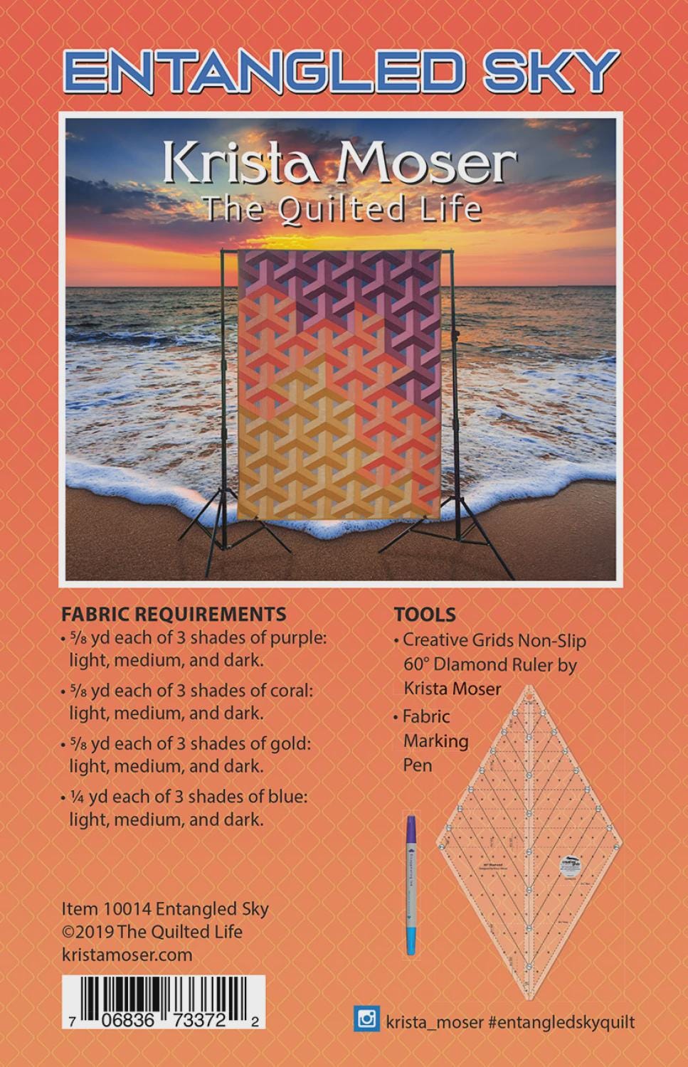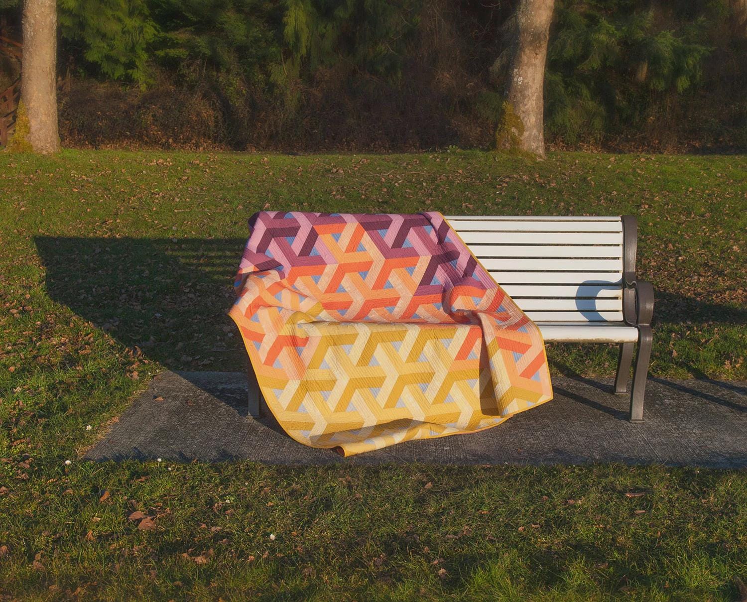 The Entangled Sky quilt is made entirely out of 2-1/2in strips and is deceptively easy to assemble. All the magic happens with three shades of each color, in light, medium, and dark. Constructed essentially from two different blocks, get a 3D effect by arranging the A and B blocks to meet each other. Achieve a complicated architectural look without all the fussy piecing. Finished size 55in x 74in
