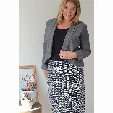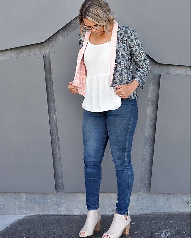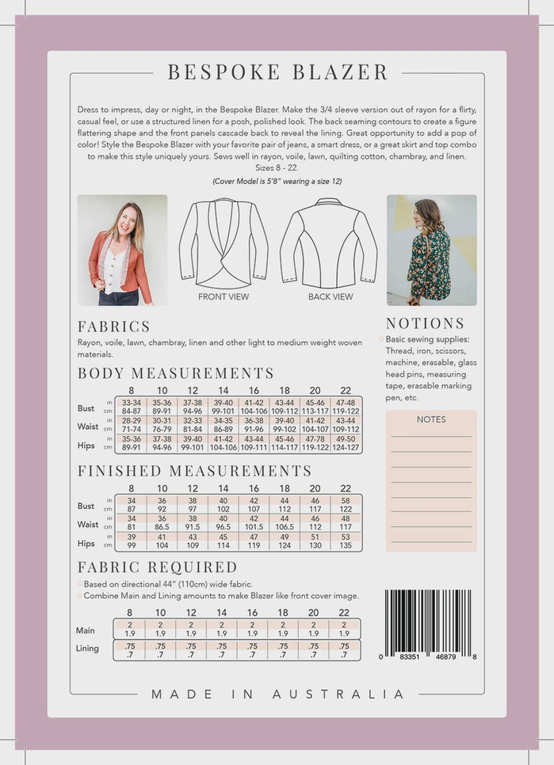 Dress to impress, day or night, in the Bespoke Blazer. Make the 3/4 sleeve version out of rayon for a flirty, casual feel, or use a structured lining for a posh, polished look. The back seaming contours to create a figure flattering shape and the front panels cascade back to reveal the lining. Great opportunity to add a pop of color! Style the Bespoke Blazer with your favorite pair of jeans, a smart dress, or a great skirt and top combo to make this style uniquely yours. Sews well in rayon, voile, lawn, quilting cotton, chambray, and linen. Sizes: 8 to 18