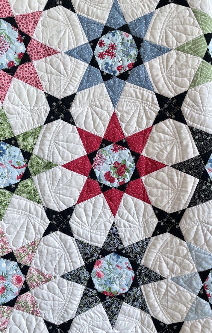 These beautiful blocks are foundation paper pieced to give you perfect accuracy on the unusual angles. The fabric is from Jill Finley’s collection ‘Perennial’ by Riley Blake.