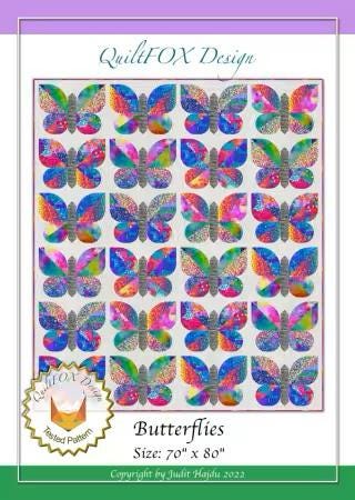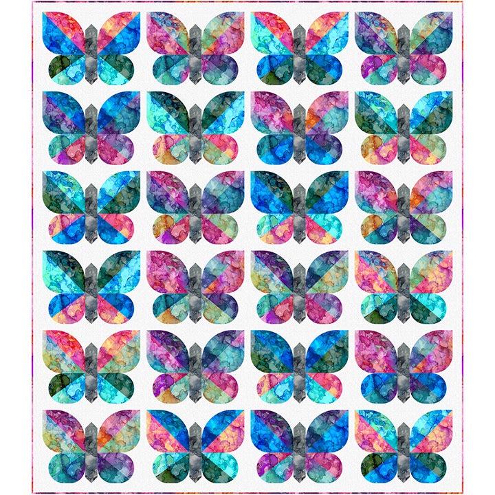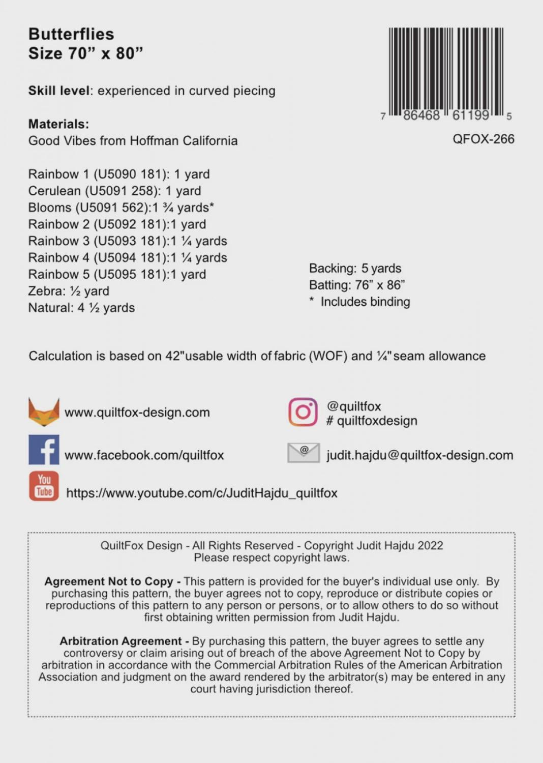 The Butterflies is featuring the Good Vibes, a Hoffman Spectrum digital print collection. The pattern is recommended for advanced quilters with curved piecing experience.