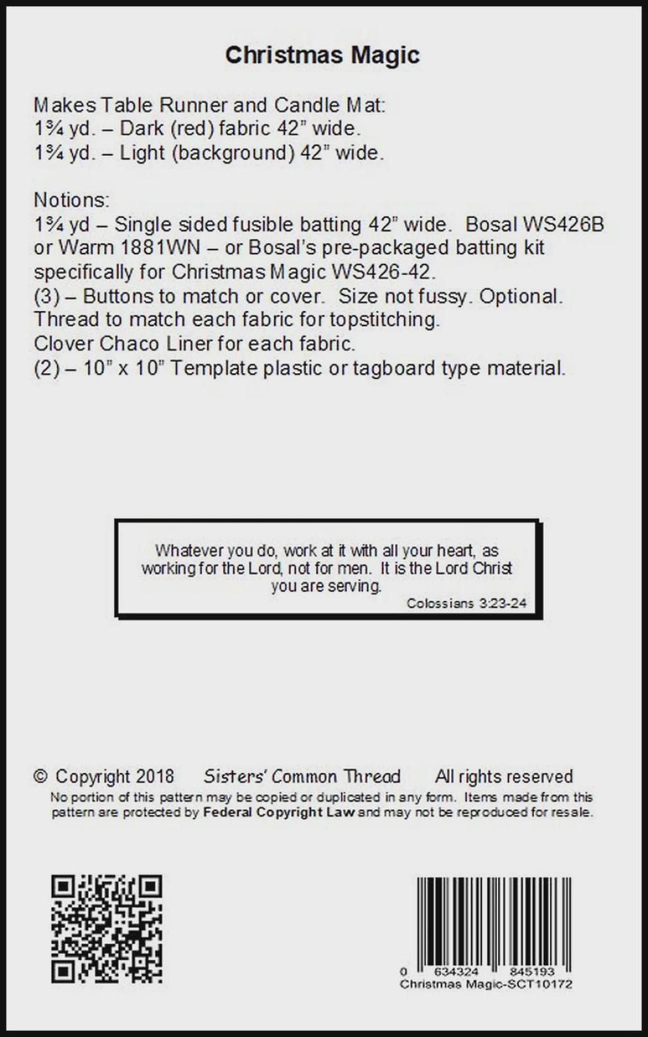 Festive weekend or camp project. This beautifully dimensioned Christmas Magic Table runner and mat set will dress up any home. Classic design with updated techniques allow you to create this fun project with NO HAND SEWING. Pattern creates 1 table runner and 1 mat - OR - 4 mats, great for gift giving.