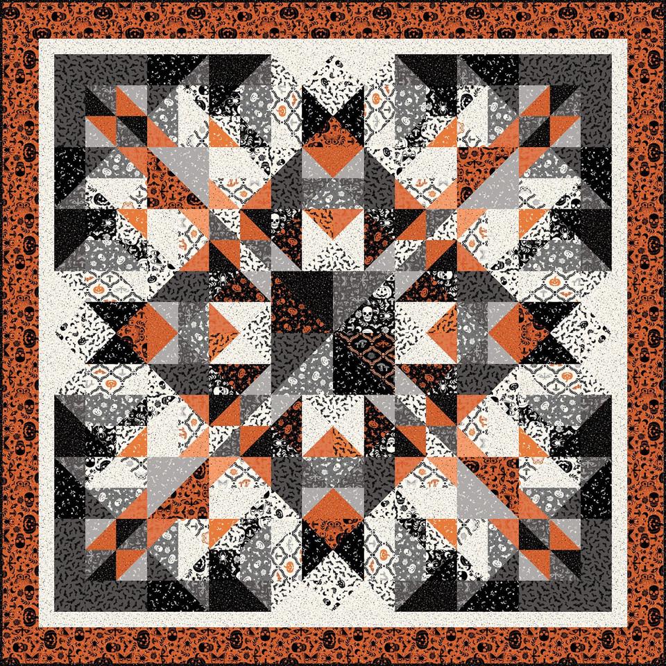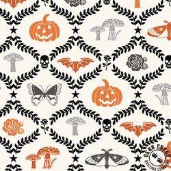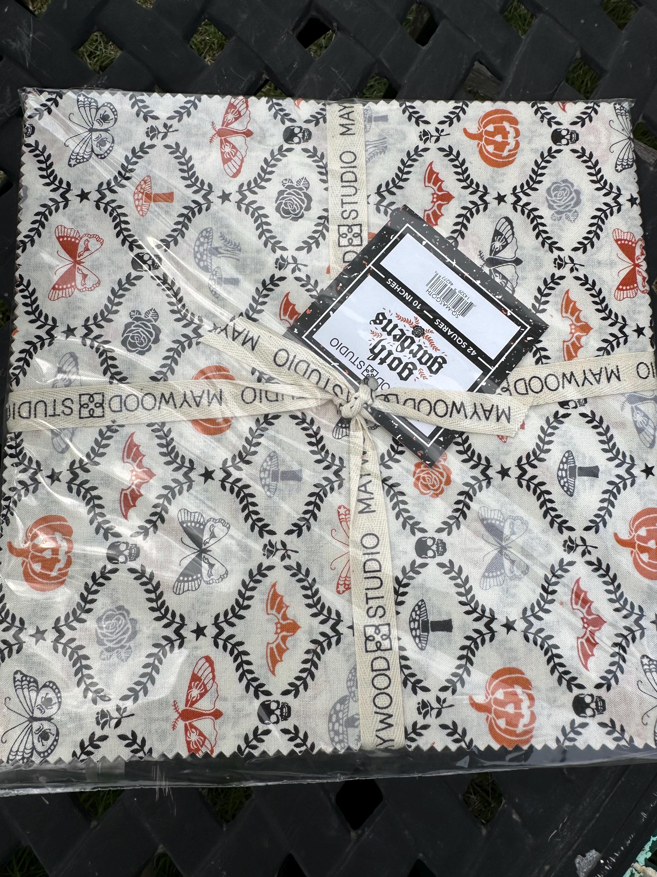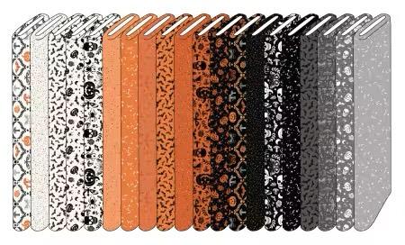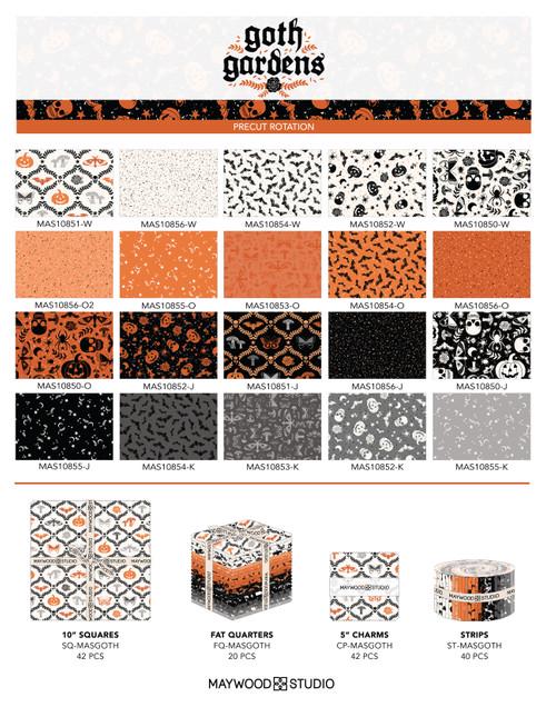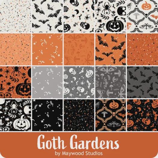 This fabric collection features a charming array of 5-inch squares, each adorned with gothic garden motifs such as pumpkins, bats, moths, and intricate vine patterns, all set against a black background with white accents. Perfect for quilters and crafters looking to add a touch of eerie elegance to their projects, this bundle offers a cohesive yet varied palette that brings a unique, thematic flair to any creation.