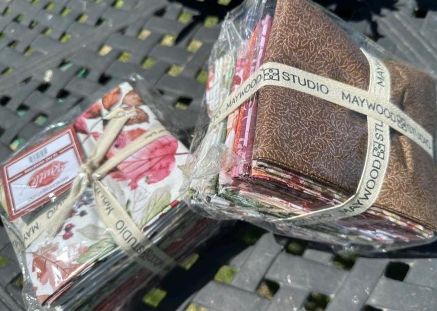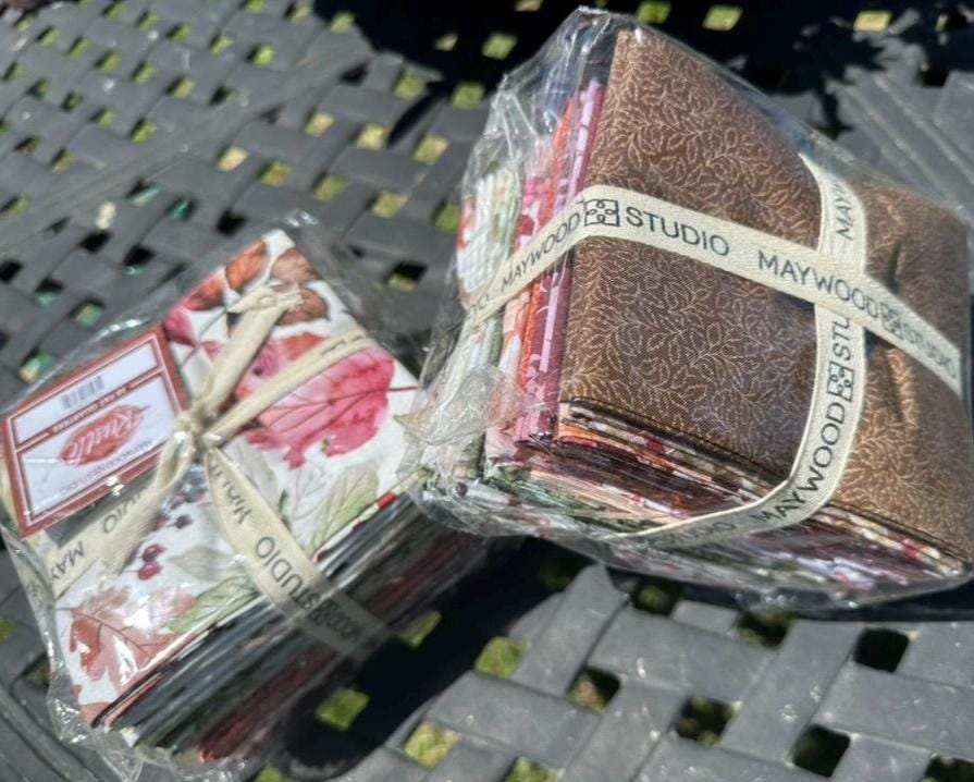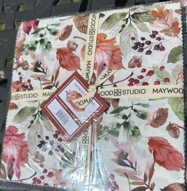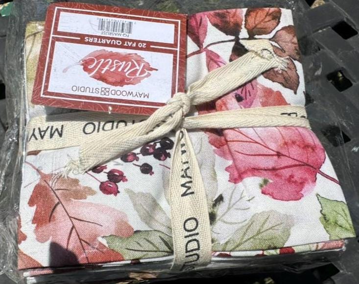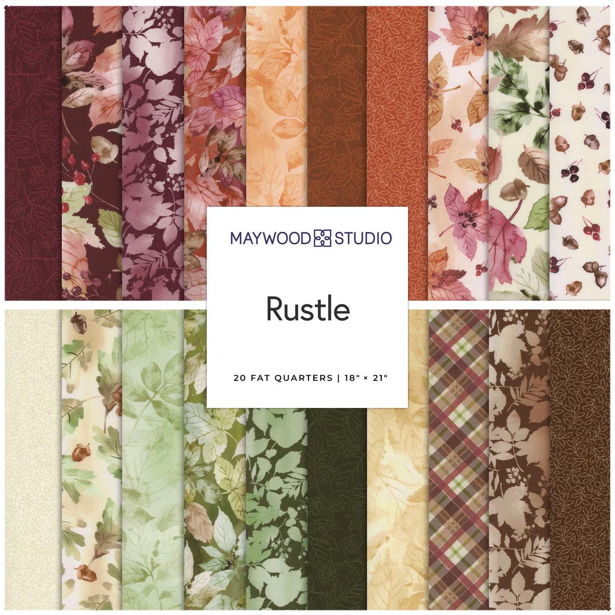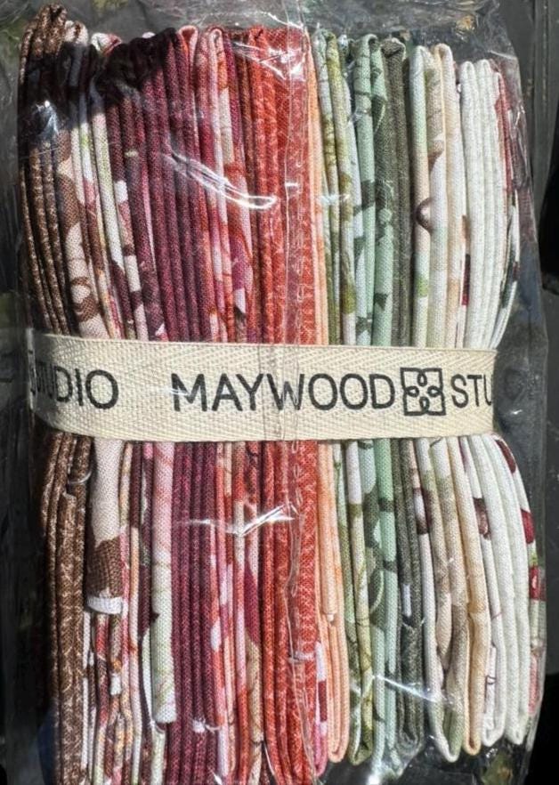 This Fat Quarter Bundle from Maywood Studio features a beautifully coordinated set of 20 pieces, each showcasing a harmonious blend of autumnal colors and intricate floral and leaf patterns. The design palette includes soft beiges, rich greens, warm oranges, deep reds, and subtle browns, creating a versatile collection perfect for quilting, crafting, and sewing projects that evoke the essence of fall. The fabric is made from high-quality 100% cotton, ensuring durability and a soft texture.