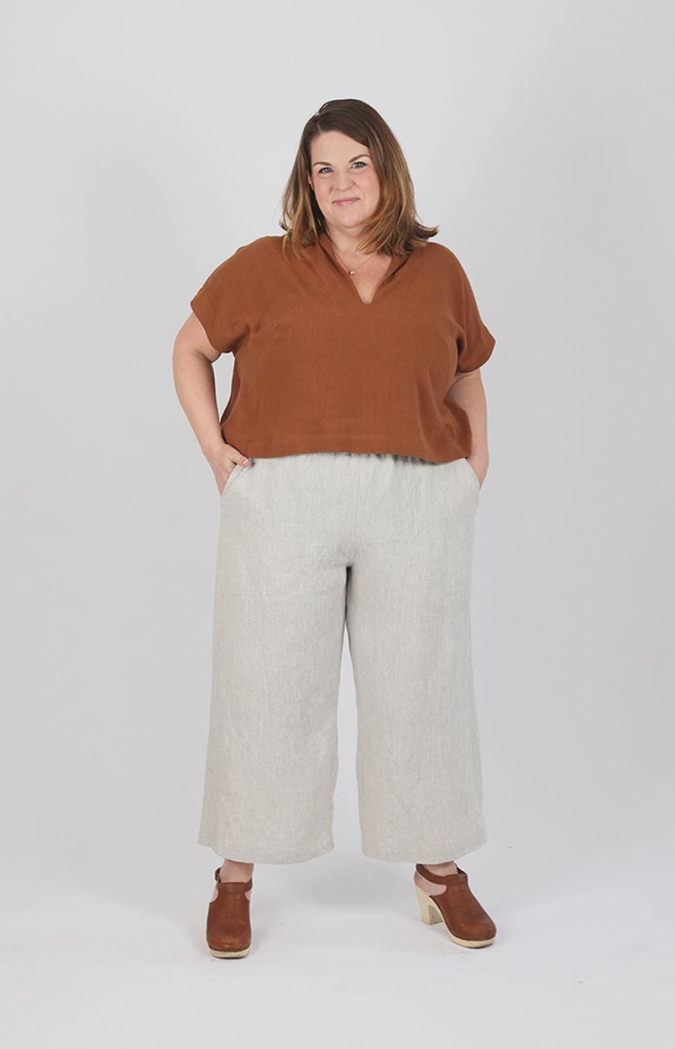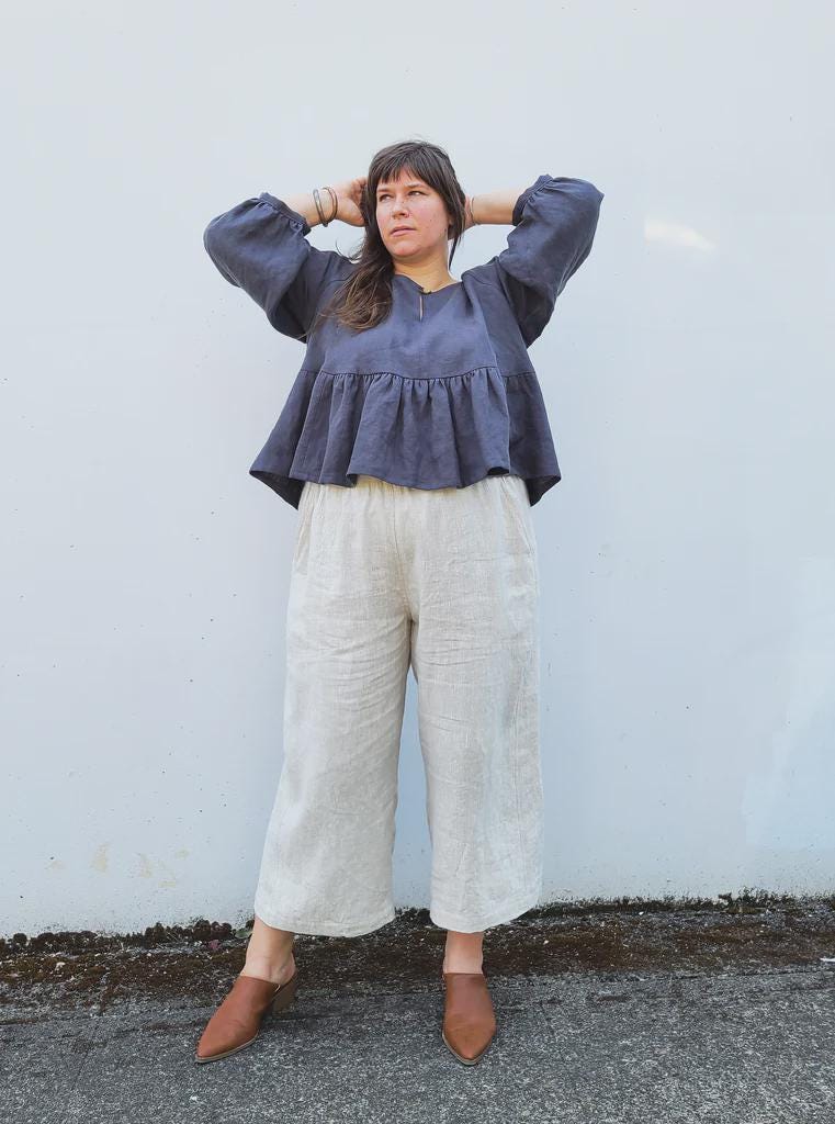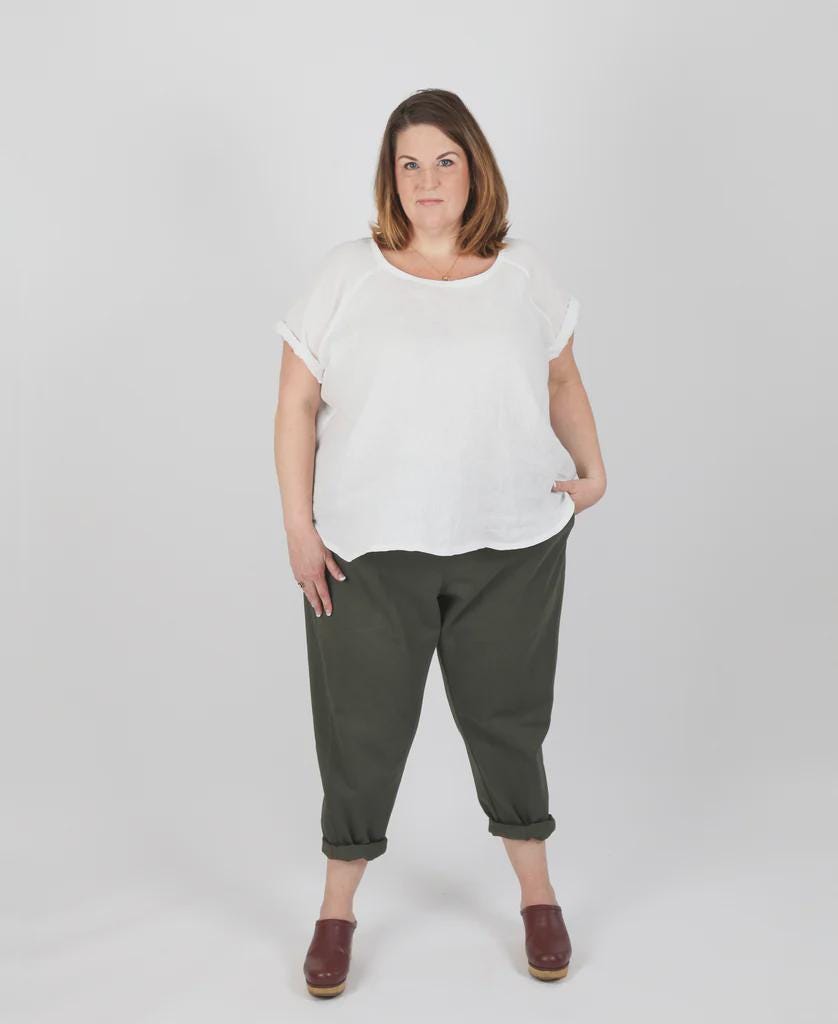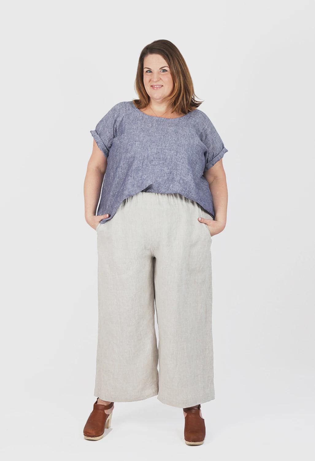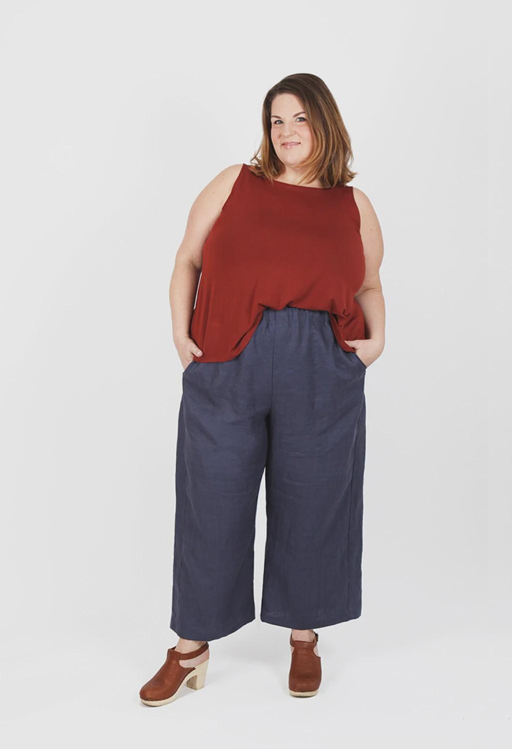 The Free Range Slacks are casual, comfortable, and timeless high-waisted pants with your choice of a wide or tapered leg. Both options have an elastic high waist, side panels, topstitched front pockets, and optional back patch pocket(s). The instructions include options for French and flat-fell leg seams.