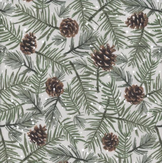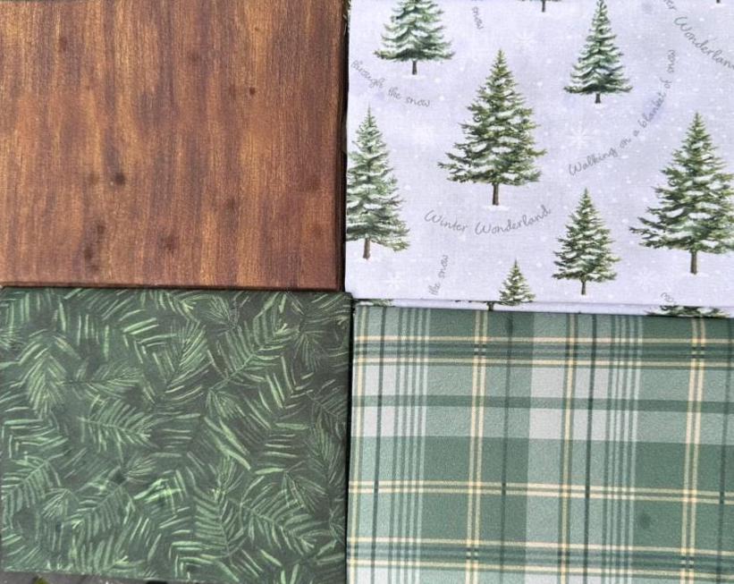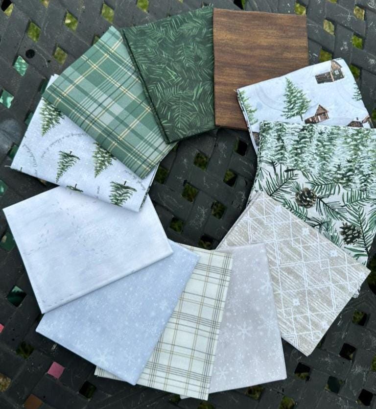 This enchanting Fat Quarter Bundle features a delightful array of winter-themed designs, perfect for crafting and quilting projects. The bundle includes patterns of pinecones, evergreen trees, woodland creatures, and subtle snowflakes, all in a harmonious palette of greens, browns, and soft whites. The mix of textures from solid prints to intricate plaids adds depth and interest, making this bundle a versatile choice for both traditional and modern winter projects.