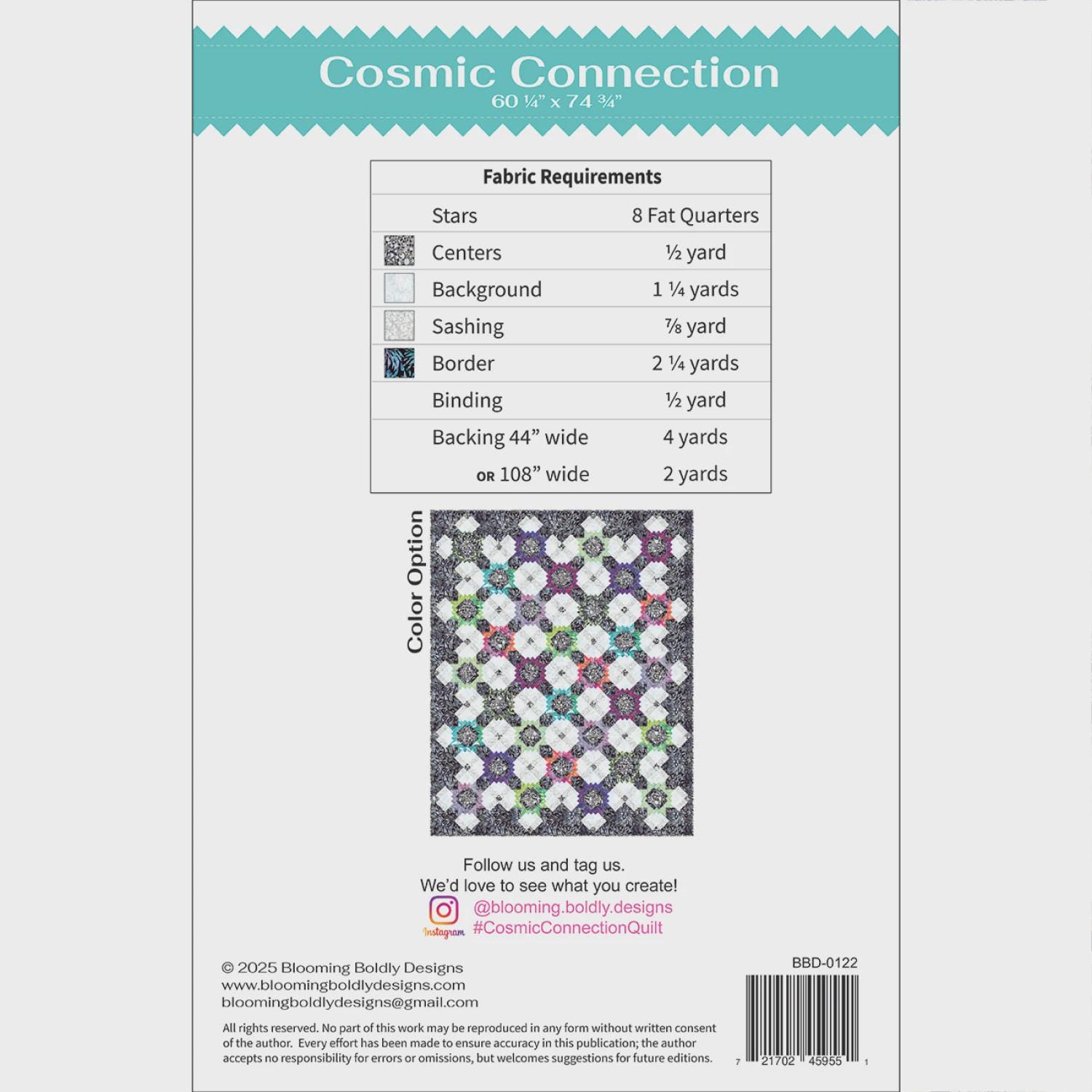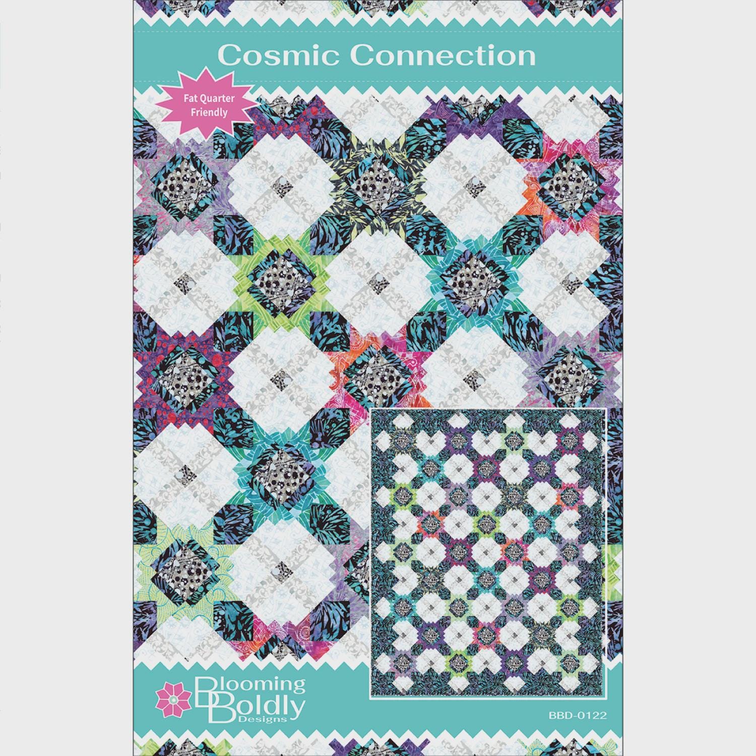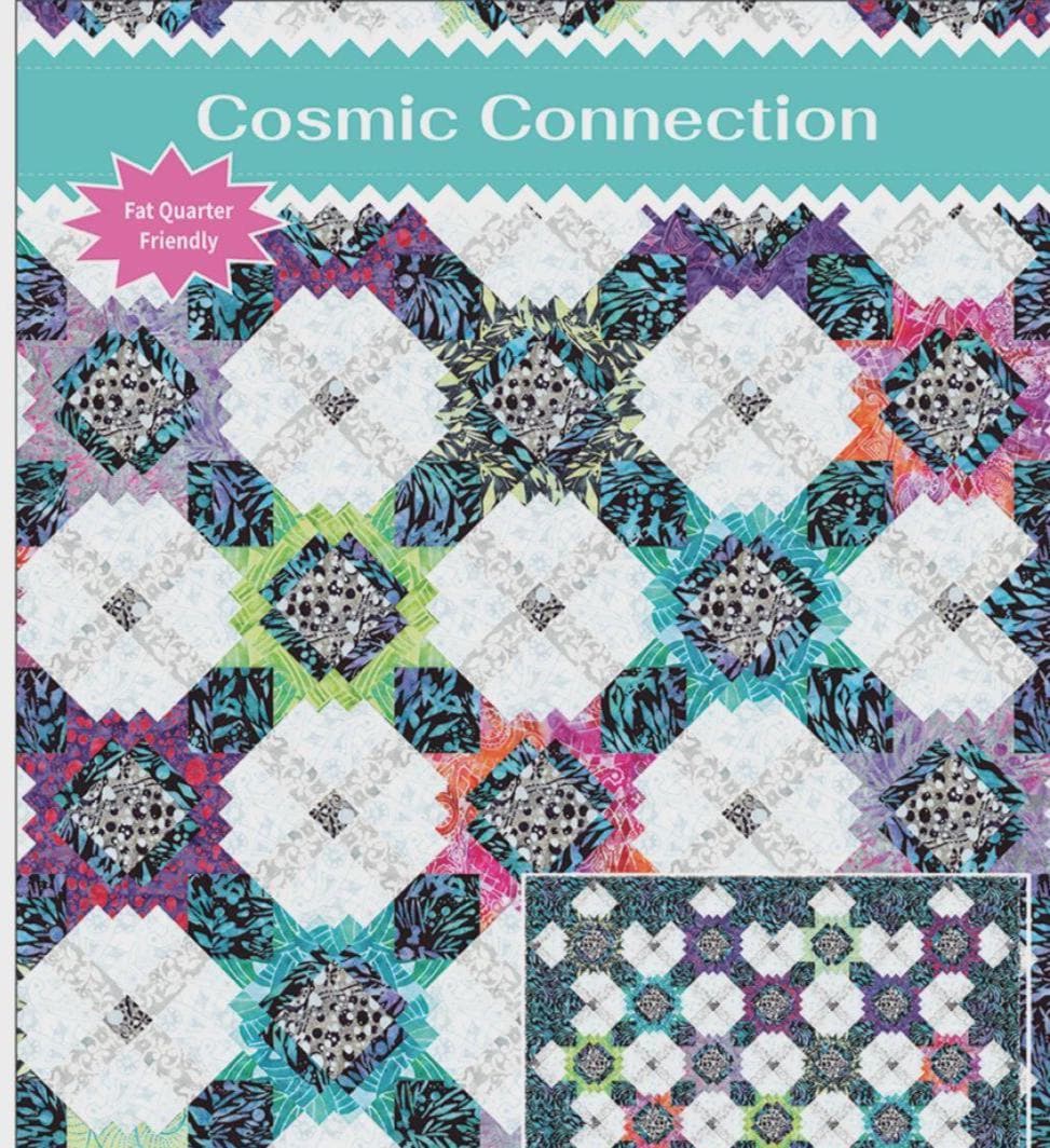 The Cosmic Connection Quilt by Leslie Ryan of Blooming Boldly Designs features an array of interconnected stars set on point. Fat quarter friendly. Traditional piecing methods. Finished size is 60 1/4" x 74 3/4".