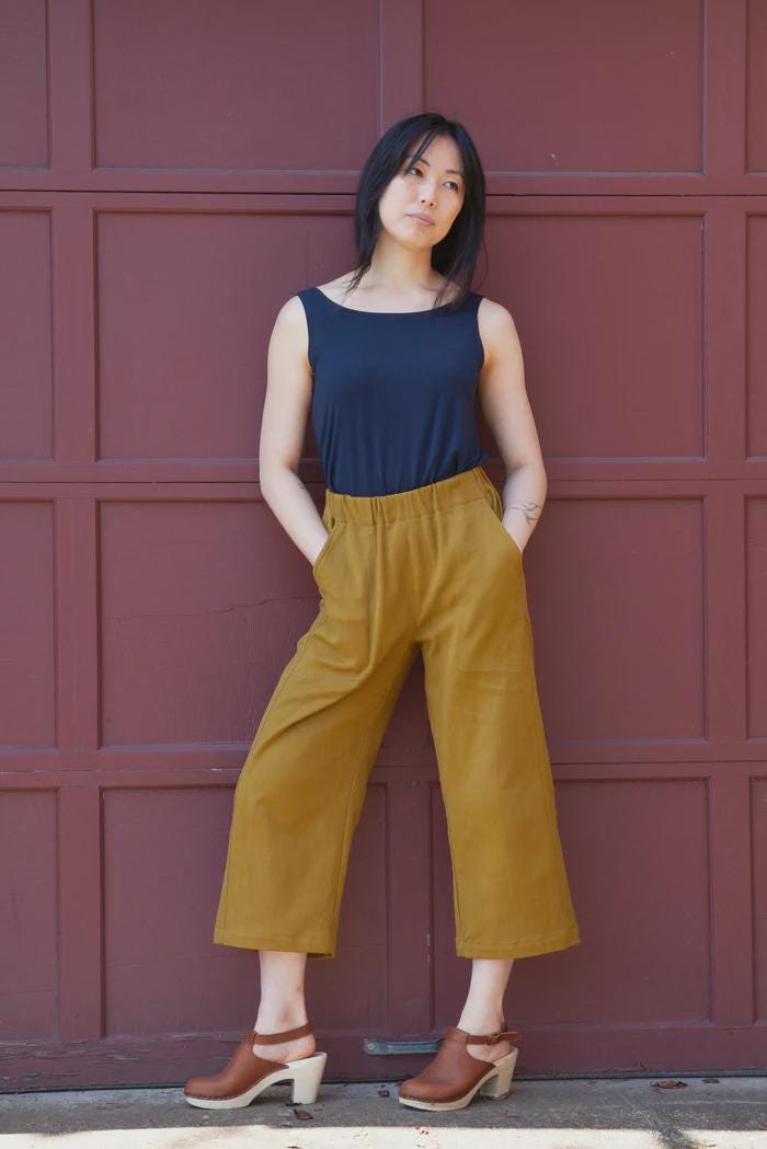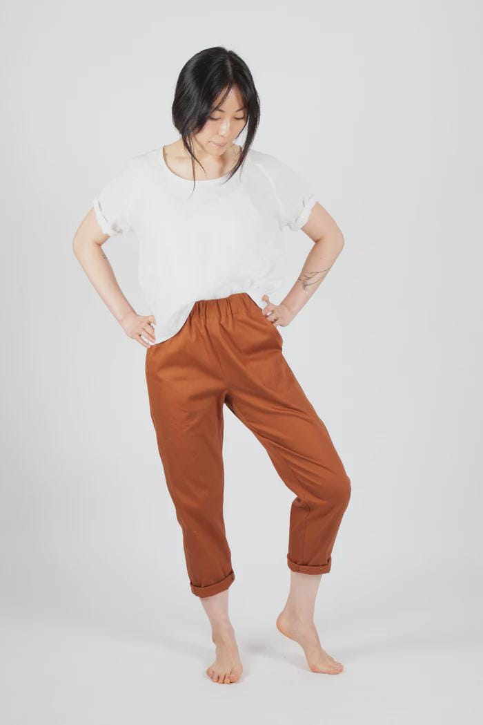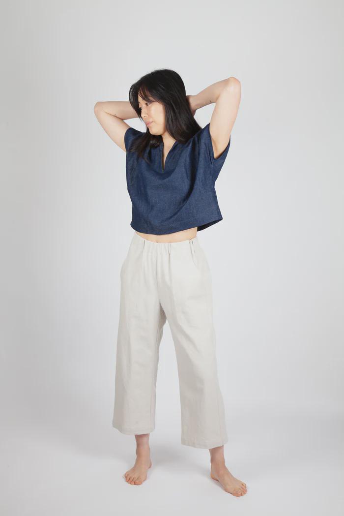 Recommended Fabrics : Bottom weight fabrics such as linen, cotton/linen blends, cotton twill, linen/viscose blends, light to nid-weight denim, tencel twill, cotton popplin, wool gabardine.