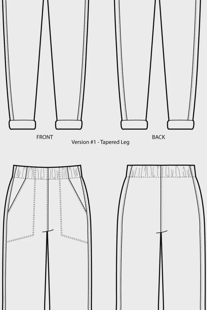 Version 1 - A tapered leg with a rolled botton hem and an option to flatfell the side seams for a clean finished look when rolled up.