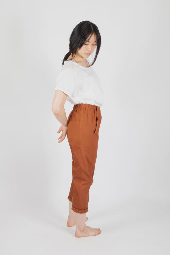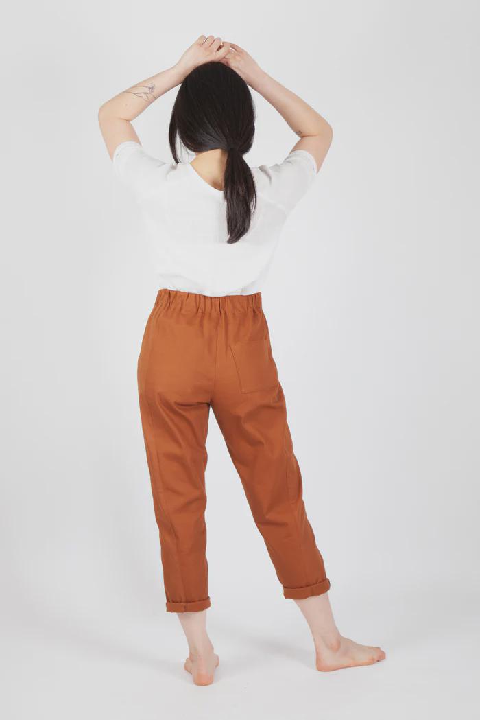 Feel free to roam in the comfort of a stylish elastic high waist when you wear the Free Range Slacks. There are two options, a tapered leg version and a straight, cropped version. Both offer a high rise elastic waist, front pockets, optional back pockets, and side panels.